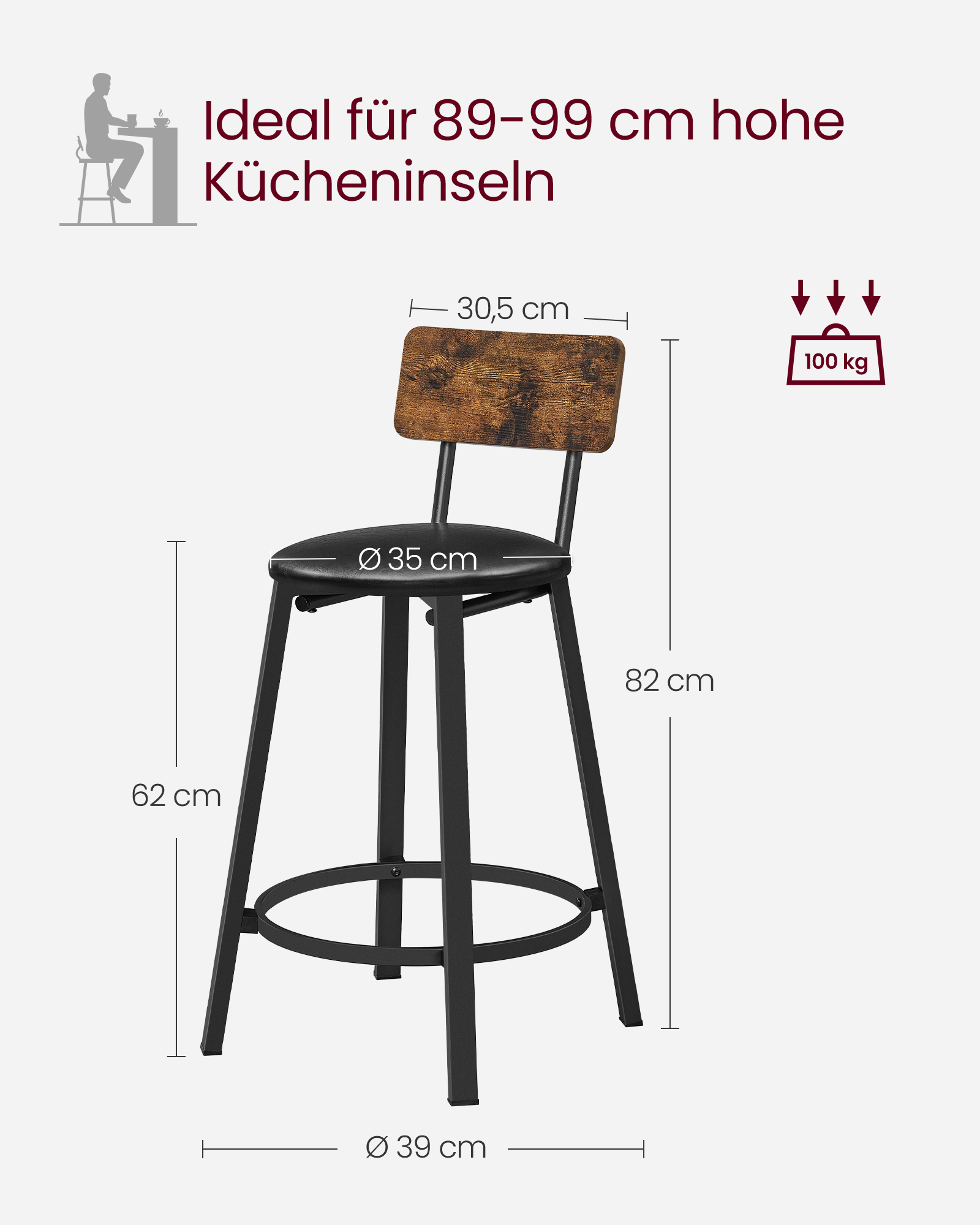- Maksimali taburetės statinė apkrova: 100 kg