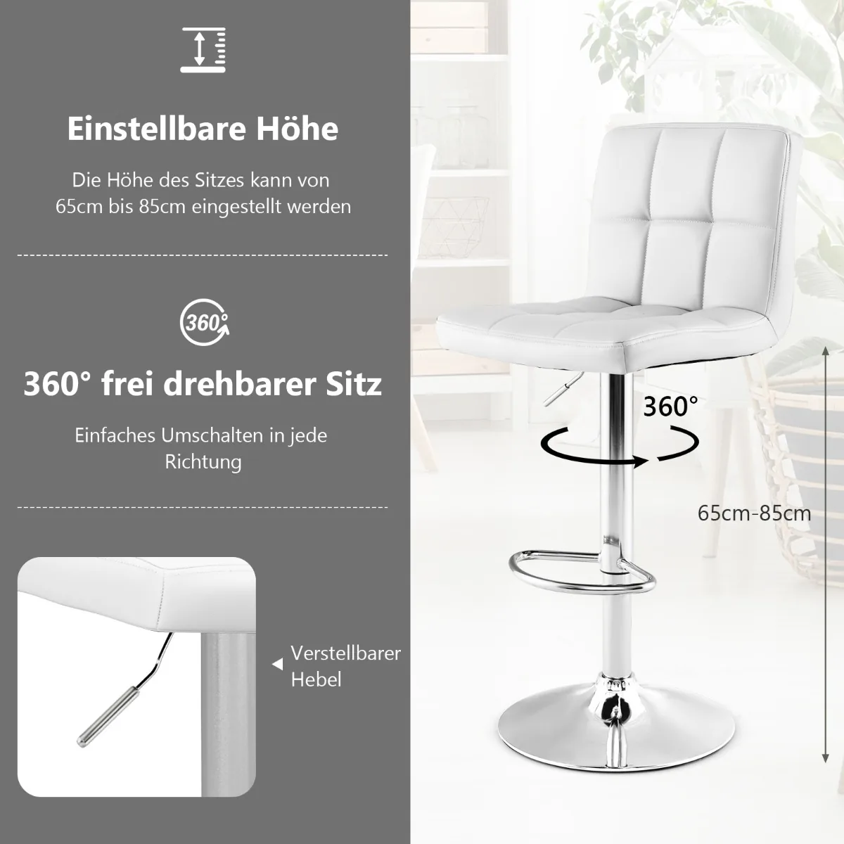 Rinkinys iš 2 baro kėdžių sidabrinės ir baltos spalvos puikiai tiks namų barui, virtuvės salone ar komercinėms erdvėms. Baro kėdės pasižymi reguliuojamu sėdynės aukščiu nuo 65 cm iki 85 cm ir 360° pasukimu, užtikrinančiu patogumą bei funkcionalumą. Patvarios medžiagos ir neslystantis pagrindas garantuoja stabilumą ir ilgalaikį naudojimą.