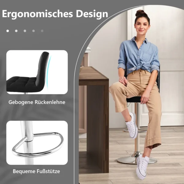 Rinkinys iš 2 baro kėdžių, pagamintų iš dirbtinės odos ir metalo, puikiai tinka naudoti namų baruose, virtuvėje ar komercinėse patalpose. Baro kėdžių matmenys 43×42,5×116,5 cm, o reguliuojamas sėdynės aukštis leidžia prisitaikyti pagal poreikį. Kėdės turi pasukamą sėdynę ir papildomą pėdų atramą, užtikrinančią komfortą ilgesnio sėdėjimo metu.