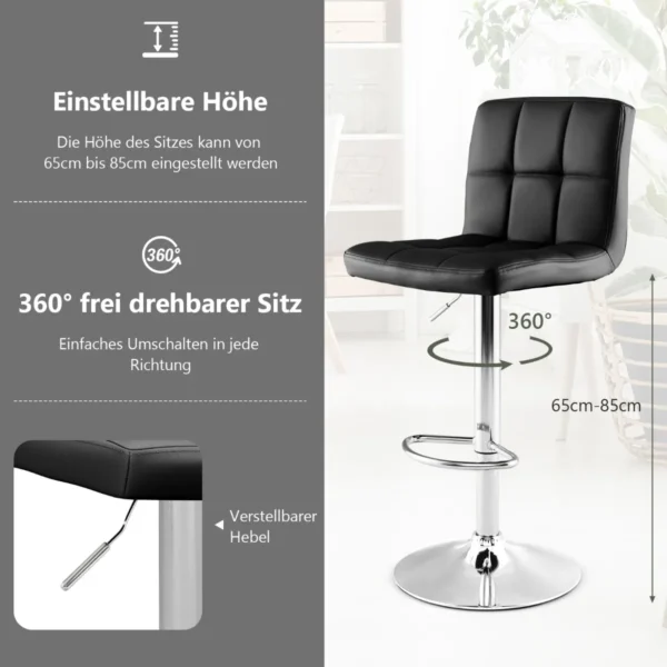 - Dviejų baro kėdžių rinkinys su reguliuojamu sėdynės aukščiu nuo 65 cm iki 85 cm.