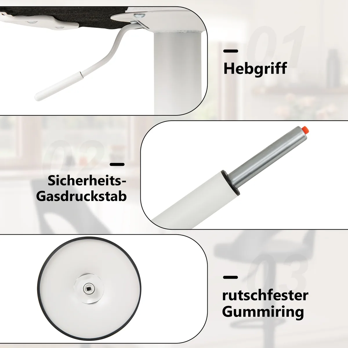 • Baro kėdės turi patikimą dujinį pakėlimo mechanizmą ir neslystantį guminį pagrindą.