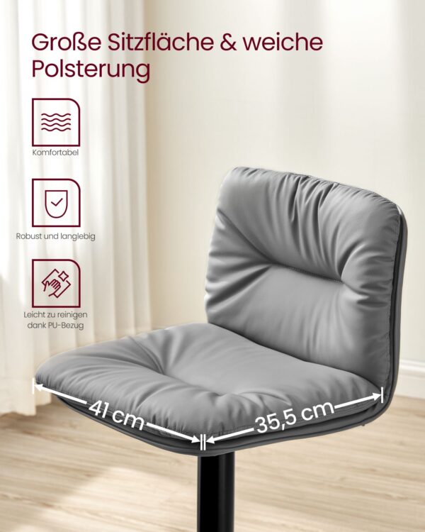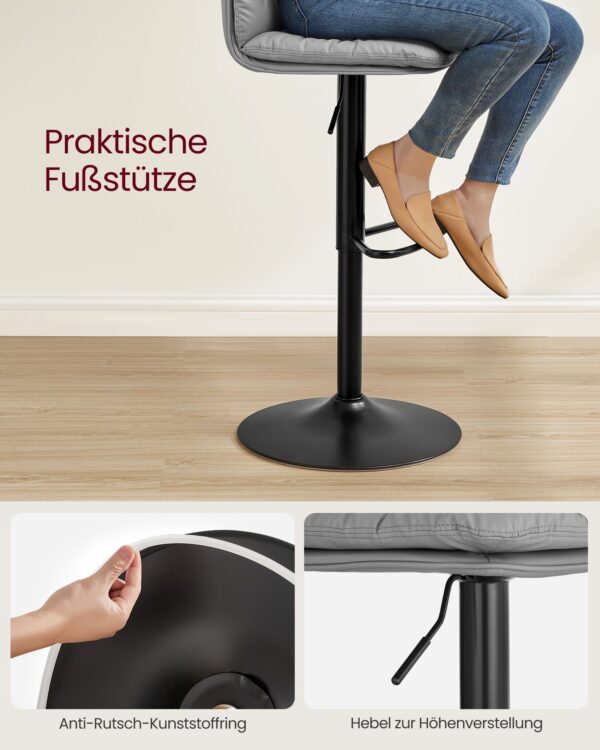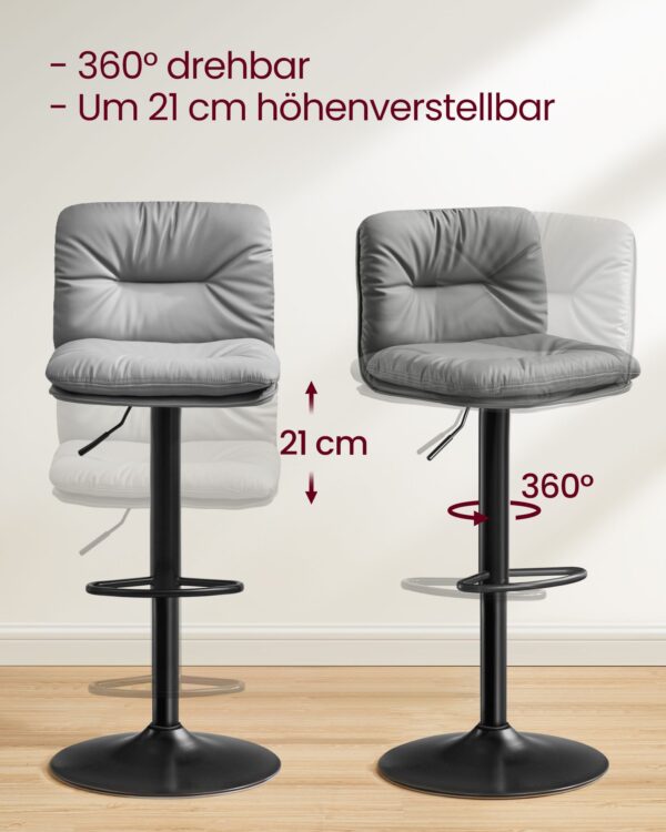 Šios baro kėdės yra pagamintos iš aukštos kokybės medžiagų, užtikrinančių ilgaamžiškumą ir patvarumą. Juodos spalvos apdaila suteikia elegancijos ir lengvai derinasi su įvairiais interjero stiliais. Reguliuojamas sėdynės aukštis leidžia pritaikyti kėdes pagal jūsų poreikius, o patogus atlošas užtikrina komfortą net ir ilgai sėdint.