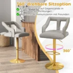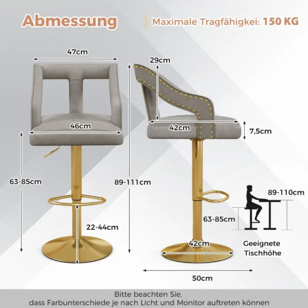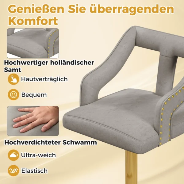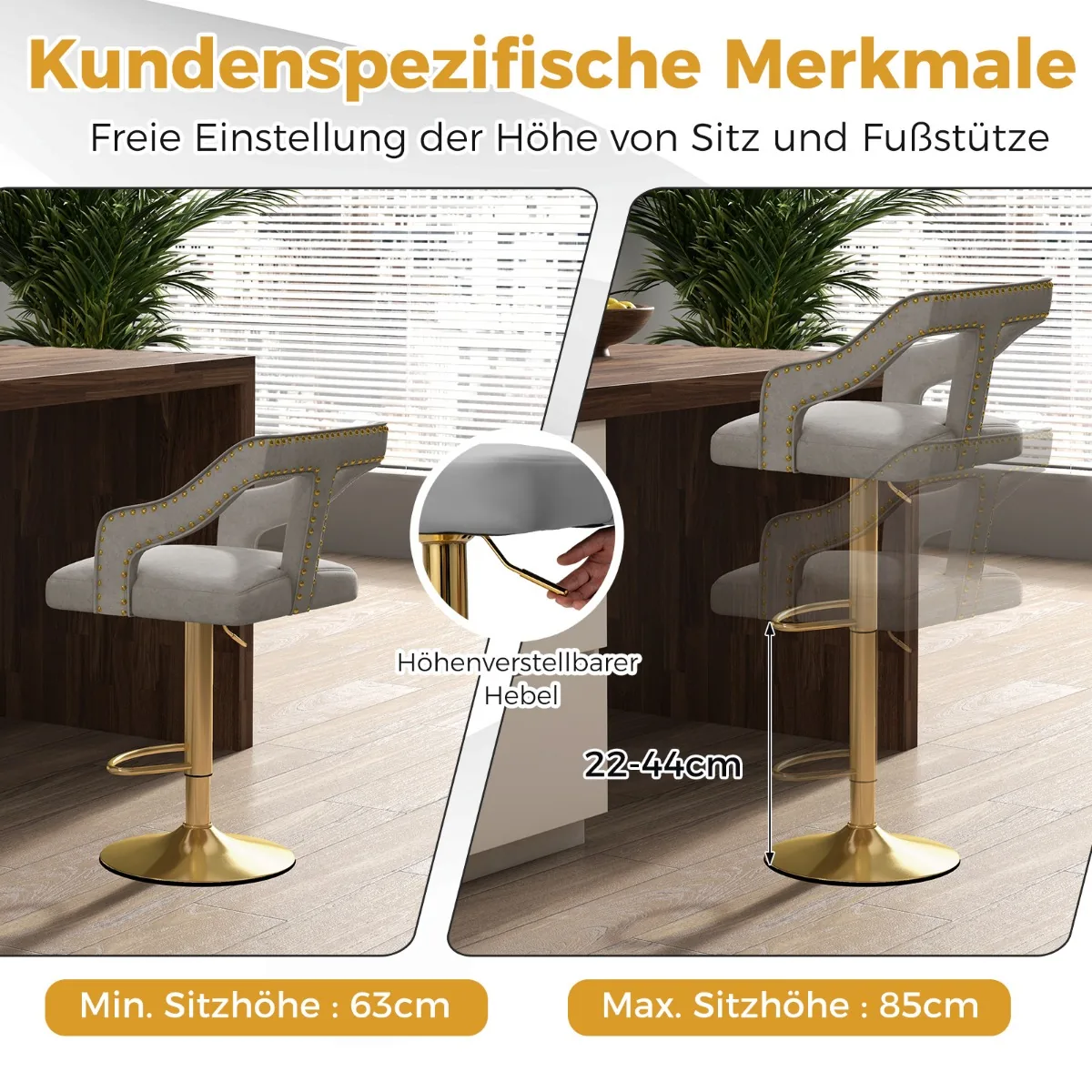 Rinkinys iš 2 baro kėdžių pilkos ir auksinės spalvos puikiai tinka virtuvei, valgomajam ar barui. Minkštu aksomu apmuštos kėdės užtikrina komfortišką sėdėjimą, o reguliuojamas dujinis keltuvas leidžia pritaikyti aukštį pagal poreikį. Pasukama sėdynė ir ergonomiška kojų atrama suteikia papildomo patogumo kasdienėje naudojimo patirtyje.