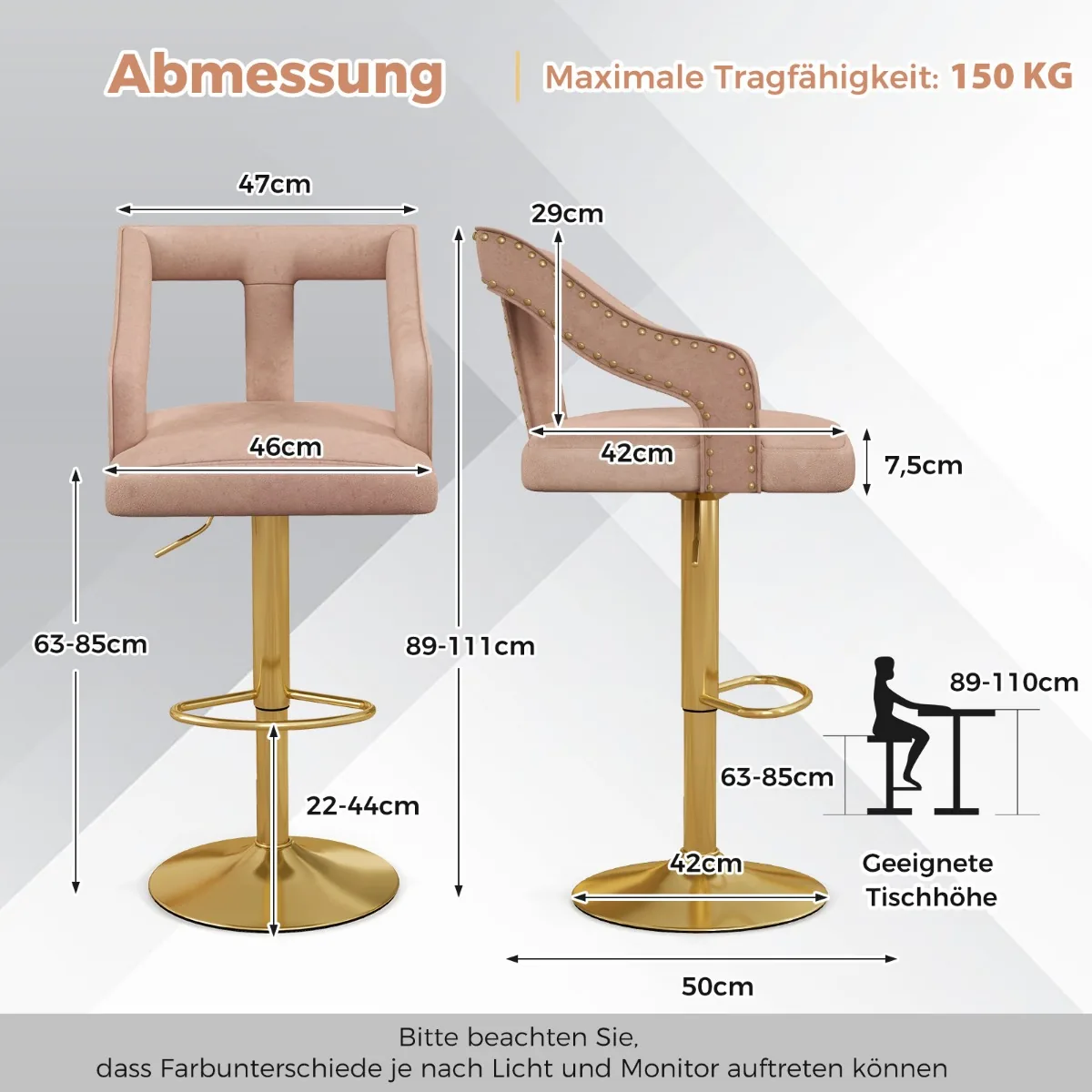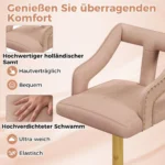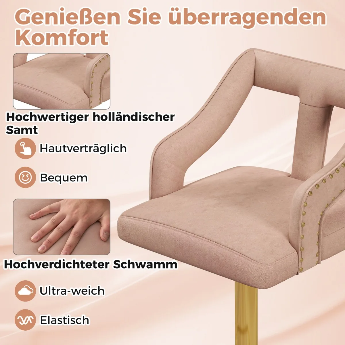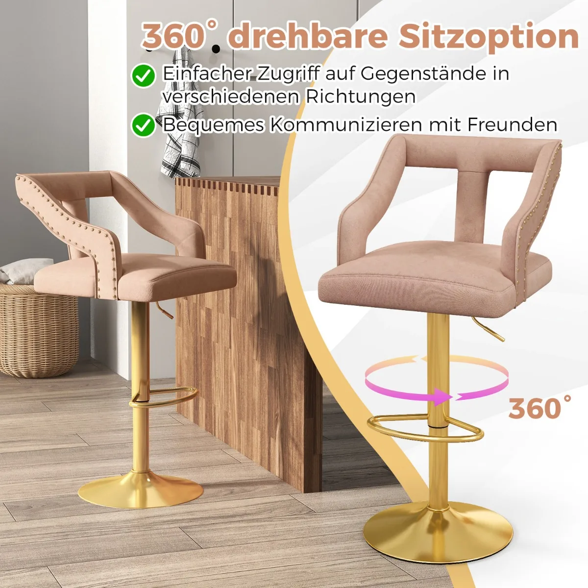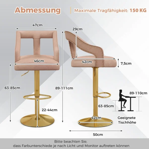 Rinkinys iš 2 baro kėdžių rožinės ir auksinės spalvos puikiai tiks valgomojo, virtuvės ar baro erdvei. Baro kėdės su minkštu aksomu užtikrina komfortą, o reguliuojamas aukštis leidžia pritaikyti sėdėjimo padėtį. Pasukamos sėdynės ir ergonomiška kojų atrama suteikia patogumo kasdieniam naudojimui.