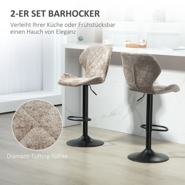 Patirkite maksimalų komfortą su mūsų elegantišku 2 dalių baro kėdžių komplektu, pagamintu iš minkšto, kvėpuojančio audinio ir tankių putų. Šios kėdės yra specialiai sukurtos maksimaliam komfortui, idealiai tinka greitiems užkandžiams ar socialiniams vakarams. Suteikite savo namams komforto, stiliaus ir funkcionalumo derinį su HOMCOM reguliuojamomis baro kėdėmis, kad valgytumėte neprilygstamą patirtį.