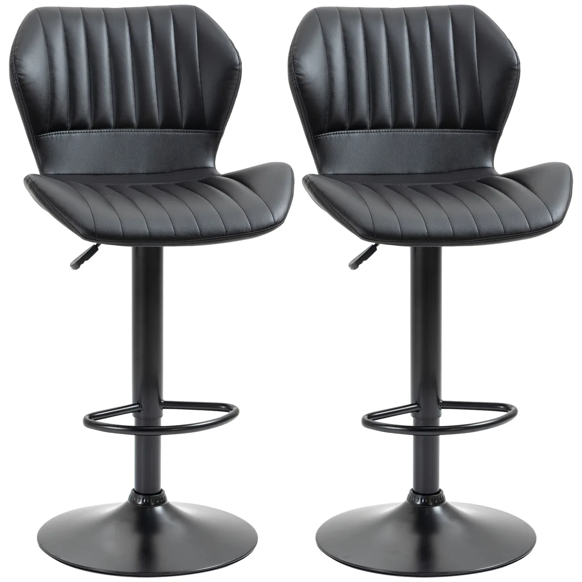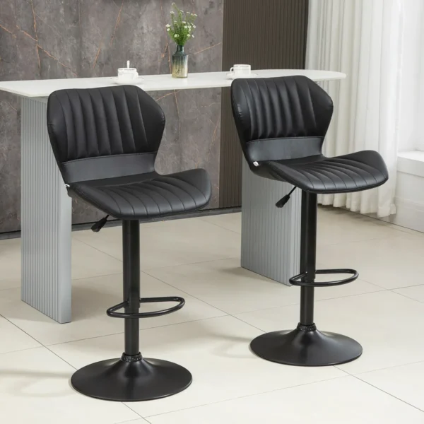 Pagyvinkite savo namus šiomis dviem skoningomis baro kėdėmis iš HOMCOM. Kriauklės formos atlošas yra ne tik ypač dekoratyvus, bet ir leidžia itin patogiai bei atsipalaidavusiai sėdėti. Įrengta laisvai besisukanti sėdynė ir praktiška kojų atrama, visada galite greitai rasti optimalią padėtį. Dėl švelnaus aukščio reguliavimo baro kėdę galima nesunkiai priderinti prie įvairiausių prekystalių ir stalų aukščių.