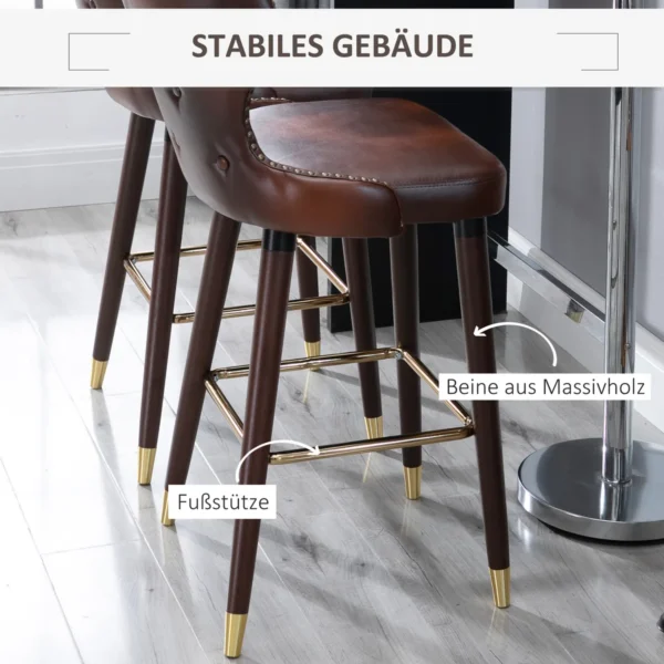 Puikus retro stiliaus įvaizdis svetainei ar pobūvių kambariui: šios elegantiškos baro kėdės su mažais atlošais iš HOMCOM yra 2 vienetų komplektas. Dėl rudos dirbtinės odos, kaimiškų kniedių ir aukso spalvos pėdų baro kėdės yra tikras retro stiliaus baldas su prabanga. Dėl minkšto paminkštinimo ir patogios pėdos atramos galėsite patogiai ir stilingai mėgautis vienu ar dviem gėrimais.