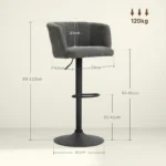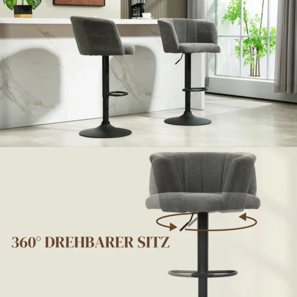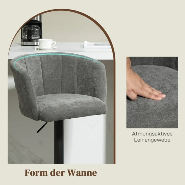 Elegantiška apvalkalo atlošas ir vamzdžio formos sėdynė kiekvienoje baro kėdėje mūsų 2 HOMCOM komplekte suteikia jūsų erdvei išskirtinio stiliaus. Reguliuojamo aukščio nuo 64 cm iki 85 cm ir 360° pasukimo galimybės baro kėdės suteikia maksimalų patogumą ir lankstumą. Šios baro kėdės, aptrauktos kvėpuojančiu audiniu ir paremtos plonu metaliniu pagrindu, puikiai dera su bet kokiu interjero stiliumi ir yra būtinas bet kokių namų elementas.