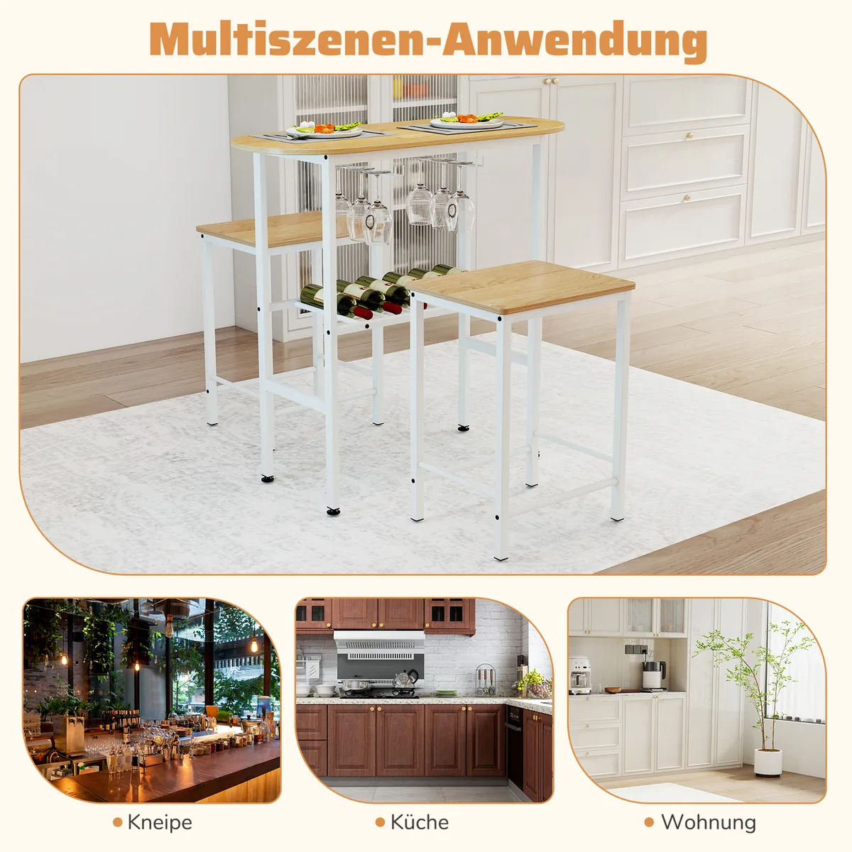 - Įkomponuoti du vyno taurių laikikliai ir vyno lentyna šviesiai rudos ir baltos spalvų dėka patogiam butelių ir indų laikymui.