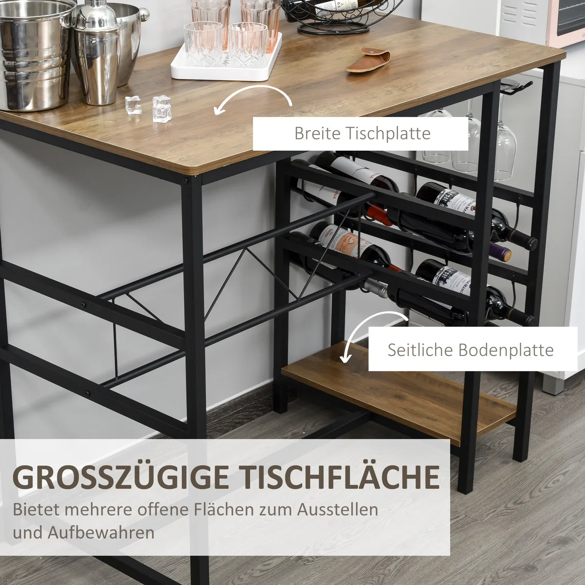 Mūsų trijų dalių HOMCOM valgomojo stalo ir kėdžių komplektas turi vintažinės medienos raštų spalvos viršų ir juodo metalo rėmą. Tai ne tik baro bistro rinkinys, bet ir atvira vyno spintelė su 2 pakopų vyno lentyna ir 2 eilių puodelių laikikliu, kad būtų lengva laikyti vyną ir sutaupyti vietos. Puikūs vidaus baldai, geriausias pasirinkimas virtuvei, aludei, svetainei ir valgomajam.