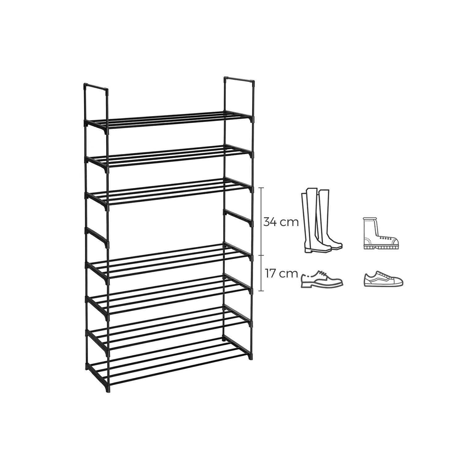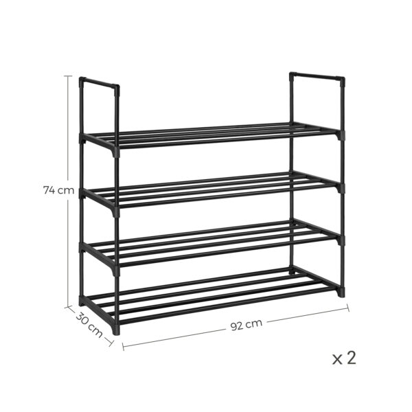 Pristatome Jums stilingą ir praktišką sprendimą batų laikymui – rinkinį iš dviejų juodos spalvos batų lentynų. Šios lentynos ne tik padės palaikyti tvarką Jūsų namuose, bet ir suteiks modernų akcentą interjerui.