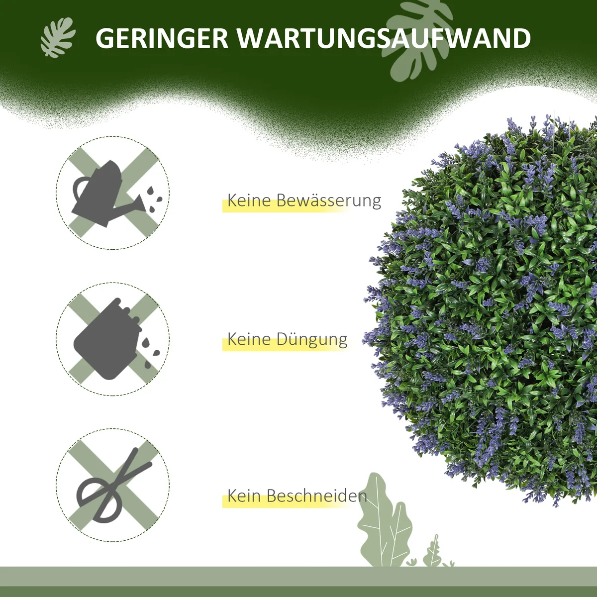 Pagyvinkite savo aplinką HOMCOM dirbtiniais levandų krūmais, sudarytais iš 455 lapų ir 225 levandų žiedų. Šie spalvingi, gyvi dirbtiniai augalai, kaip ir tikri, sukuria natūralius akcentus viduje ir lauke, nereikalaujant priežiūros. Patirkite ilgalaikį žalios spalvos spindesį su šiuo dirbtiniu augalu.