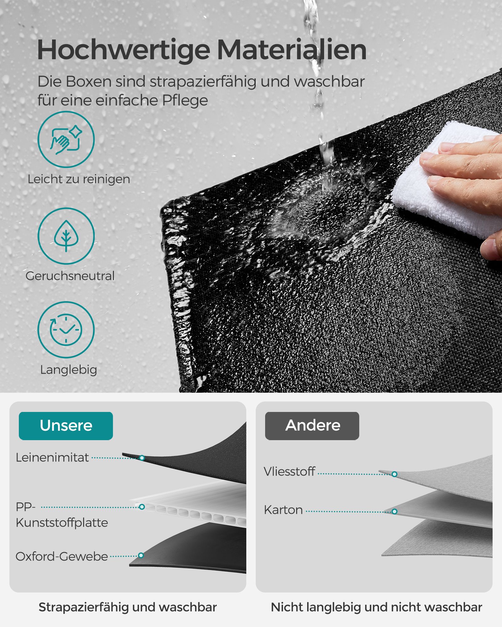 - Medžiaga: Lino imitacija, Oksfordo audinys ir PP plastikas (polipropilenas) – užtikrina ilgaamžiškumą ir patvarumą.