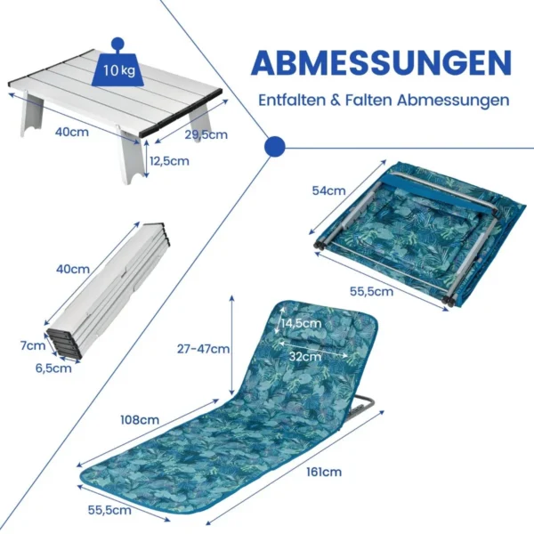 Rinkinys iš 2 gultų ir staliuko – praktiškas sprendimas poilsiui lauke. Šie sulankstomi gultai ir staliukas puikiai tinka paplūdimiui, stovyklavimui ar sodui. Lengvai transportuojamas ir patogus naudoti tiek lauke, tiek terasoje.
