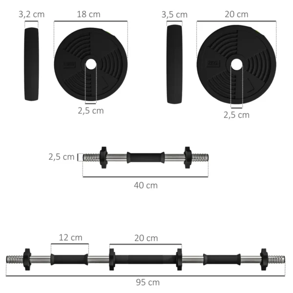 - 15 kg svorio rinkinys: 4 x 2 kg ir 4 x 1,5 kg svareliai. 2 x 0,5 kg štangos.