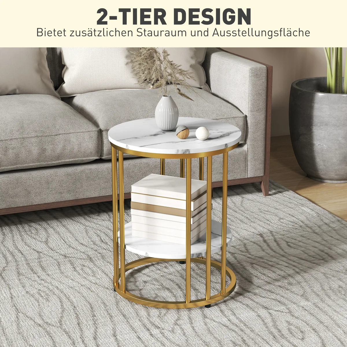 Optimizuokite savo gyvenimo atmosferą su elegantišku HOMCOM kavos staliuko komplektu. Šį stilingą ansamblį sudaro du universalūs marmuro išvaizdos šoniniai stalai su elegantiškomis auksinėmis metalinėmis kojomis, idealiai tinkantys bendram arba individualiam naudojimui. Dviejų sluoksnių stalviršio dėka pasinaudokite dviguba saugykla.