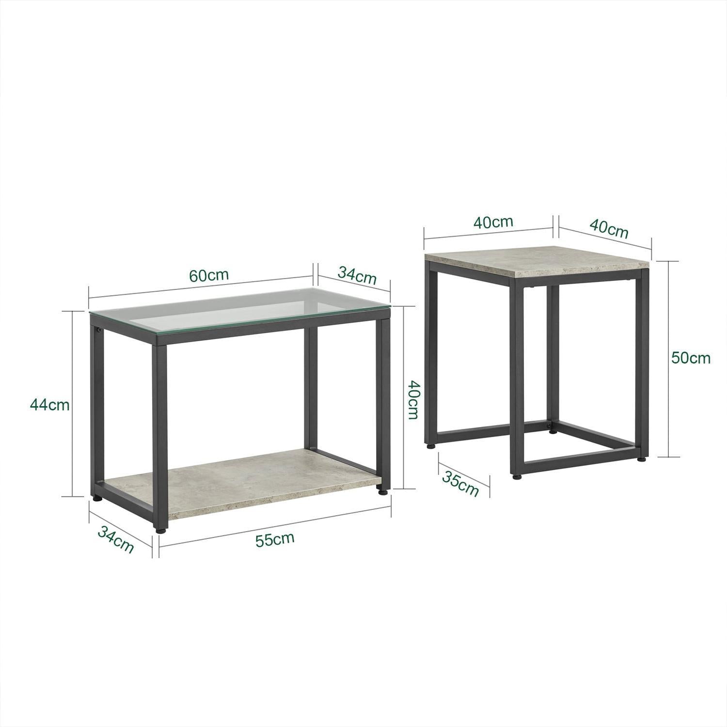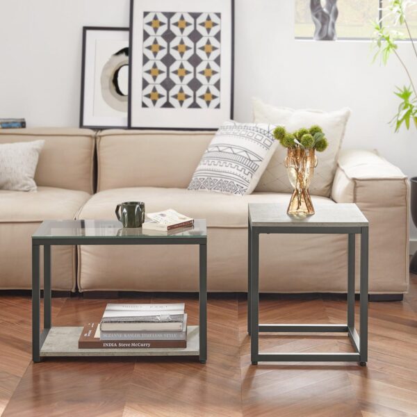 Rinkinys iš 2 kavos staliukų, juodos/pilkos spalvos, suteikia jūsų kambariui autentišką jausmą ir žavesį. Šiuos staliukus galite naudoti atskirai arba sujungti, kad sutaupytumėte vietos. Staliukų stalviršiai pagaminti iš grūdinto stiklo, kuris yra atsparus dėmėms ir lengvai valomas. Būkite atsargūs! Pažeistas kraštas ar subraižytas paviršius gali sukelti staigų stiklo skilimą ar lūžimą.