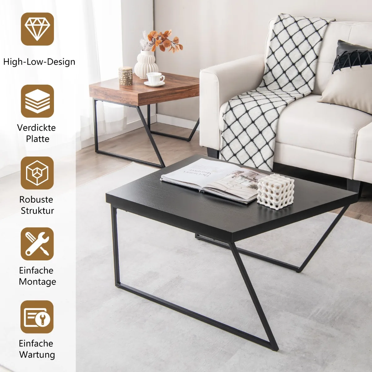 Rinkinys iš 2 kavos staliukų juodos ir rudos spalvos puikiai tinka svetainės erdvės praturtinimui. Šie kavos staliukai leidžia lanksčiai pritaikyti baldus pagal poreikį – naudoti atskirai arba kartu. Erdvi stalviršio dalis užtikrina patogią daiktų laikymo vietą.