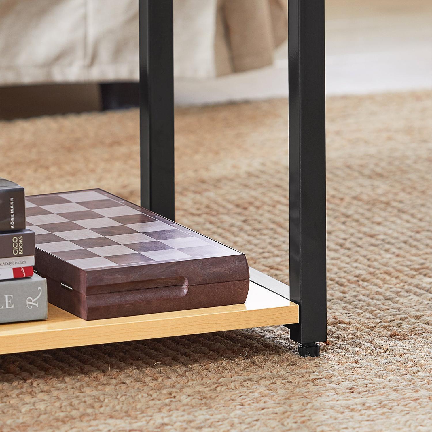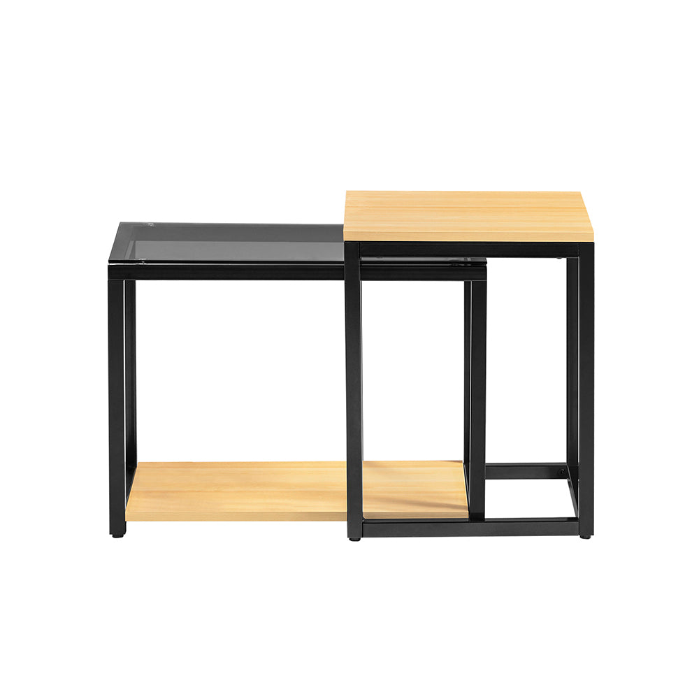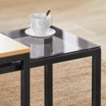 Šis rinkinys iš 2 kavos staliukų, juodos ir šviesiai rudos spalvos, suteikia jūsų kambariui autentiškumo ir žavesio. Galite naudoti juos atskirai arba sujungti, kad sutaupytumėte vietos. Staliukų stalviršiai pagaminti iš grūdinto stiklo, kuris yra atsparus dėmėms ir lengvai valomas. Būkite atsargūs! Pažeistas kraštas ar subraižytas paviršius gali sukelti staigų stiklo skilimą ar lūžimą.