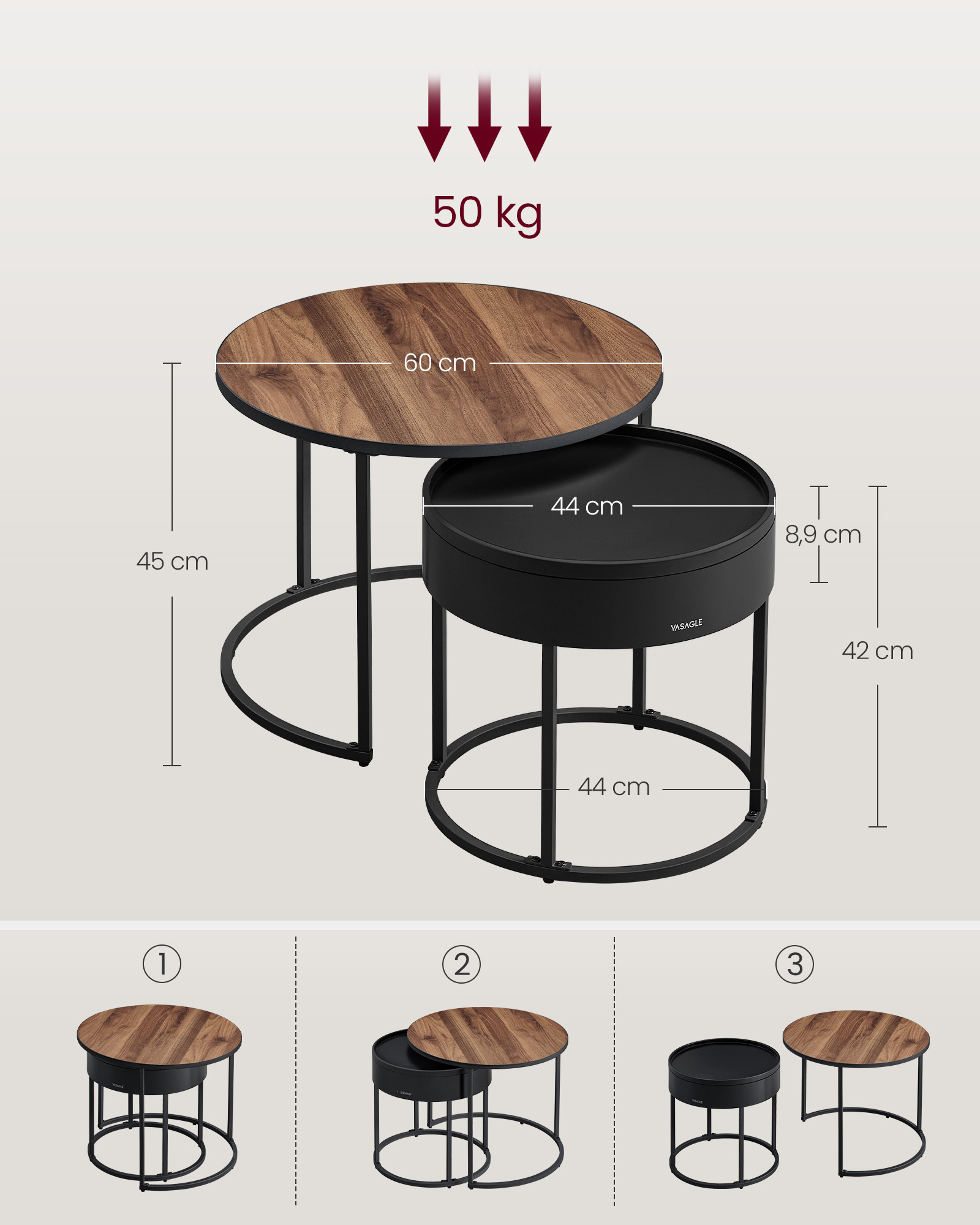 Šis kavos staliukų rinkinys yra puikus pasirinkimas tiems, kurie vertina kokybę ir stilių. Jo tvirtos medžiagos ir elegantiškas dizainas užtikrina ilgaamžiškumą ir universalumą, todėl jis taps nepakeičiamu jūsų namų akcentu.