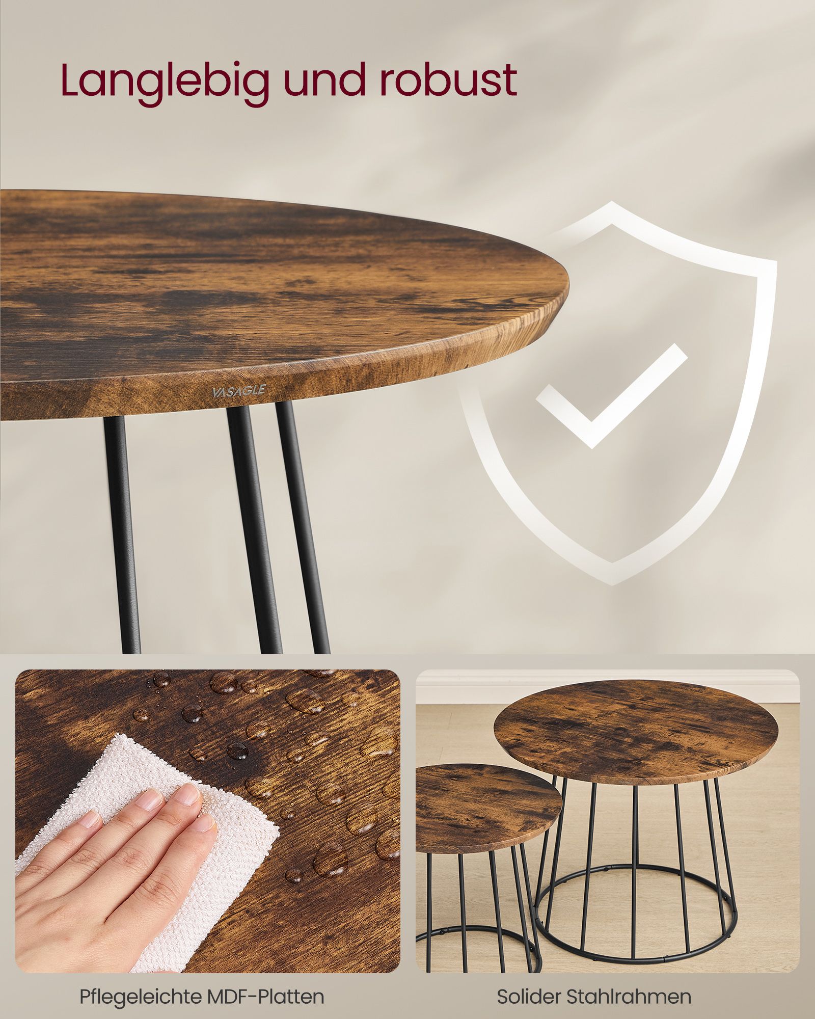 Šis kavos staliukų rinkinys yra ne tik praktiškas, bet ir stilingas sprendimas jūsų namams. Jo tvirtas plieninis rėmas ir kokybiška MDF plokštė užtikrina ilgaamžiškumą ir stabilumą, o vintažinė ruda spalva suteikia jaukumo ir elegancijos. Pasirinkite šį rinkinį, kad jūsų svetainė taptų dar patrauklesnė ir funkcionalesnė.