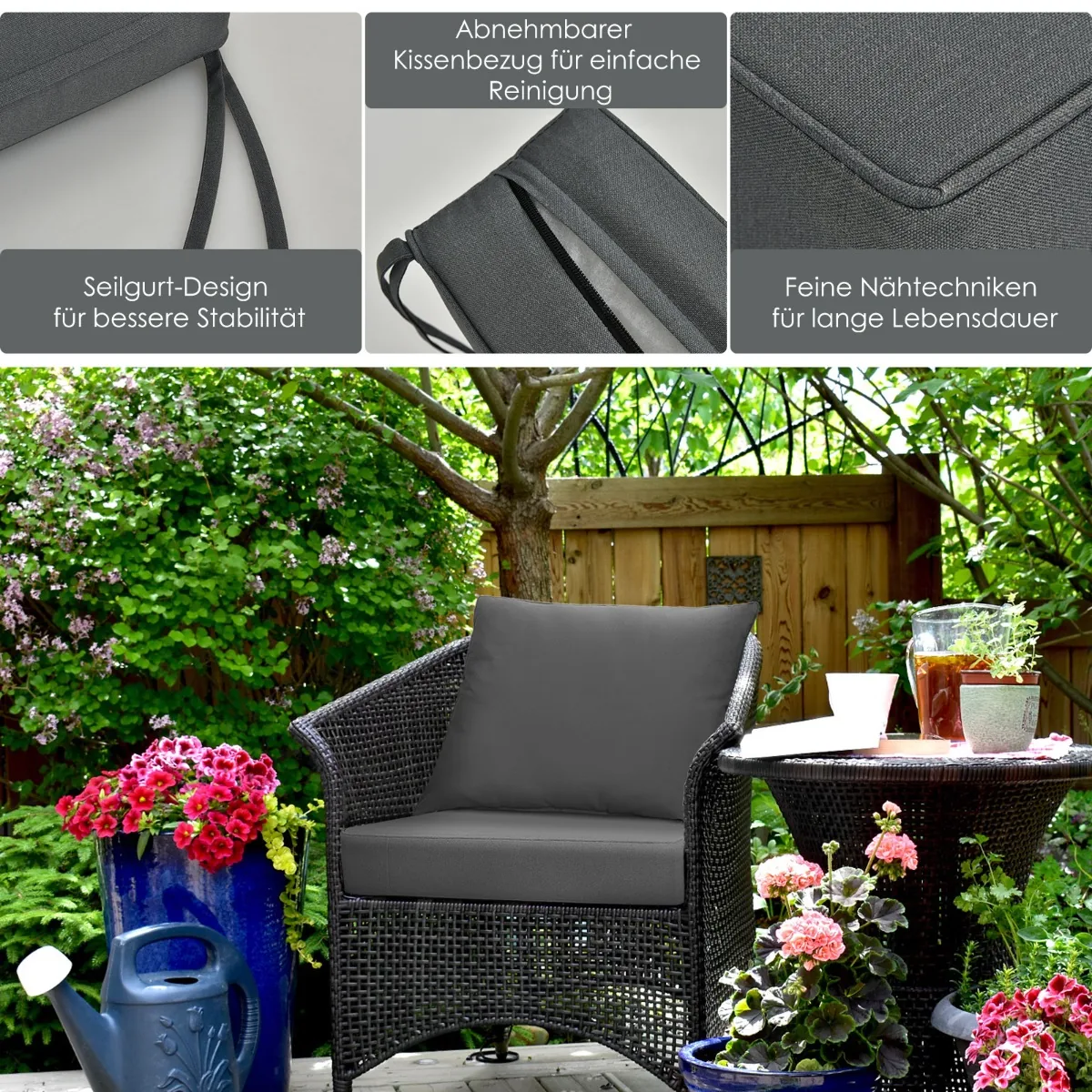 - Rinkinį sudaro sėdynės pagalvėlė ir nugaros pagalvėlė, skirtos naudoti kartu su įvairių tipų kėdėmis – pinto, aliuminio ar geležinėmis.