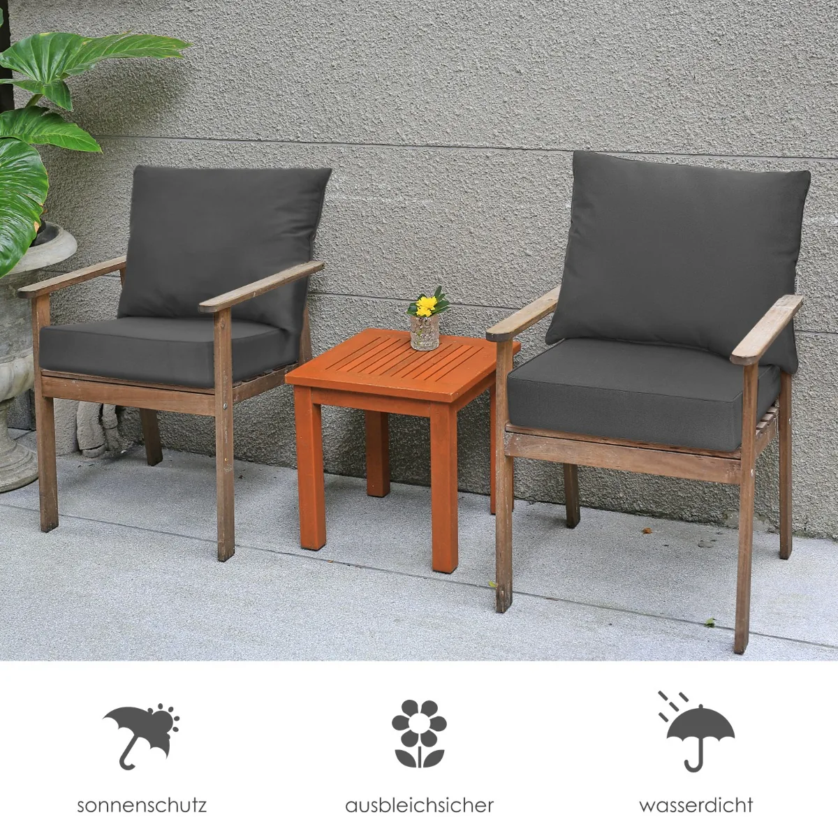 - Pagalvėlių medžiaga – vandeniui atsparus poliesterio audinys, kuris apsaugo nuo drėgmės ir saulės spindulių poveikio.