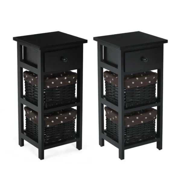 Rinkinys iš 2 naktinių staliukų 28x26x60 cm juodos spalvos – praktiškas sprendimas jūsų miegamajam ar svetainei. Pagaminti iš patvarios Paulownia medienos, šie naktiniai staliukai atitinka įvairius kasdienius poreikius ir padeda palaikyti tvarką kambaryje. Kompaktiško dydžio ir funkcionalaus dizaino, jie puikiai dera prie skirtingų interjerų.
