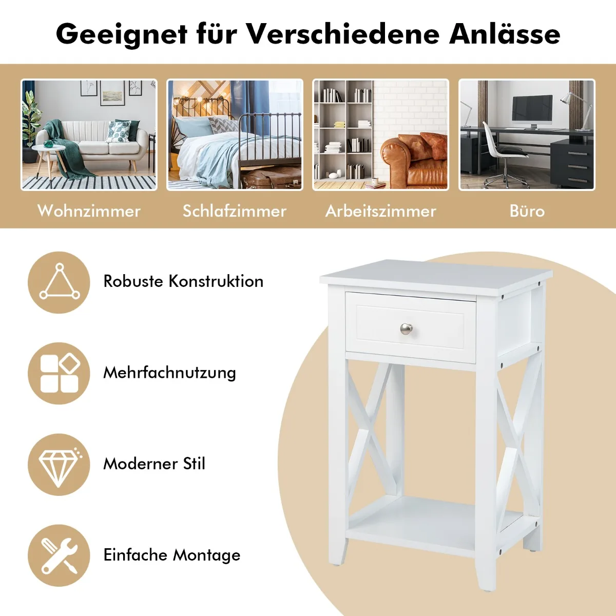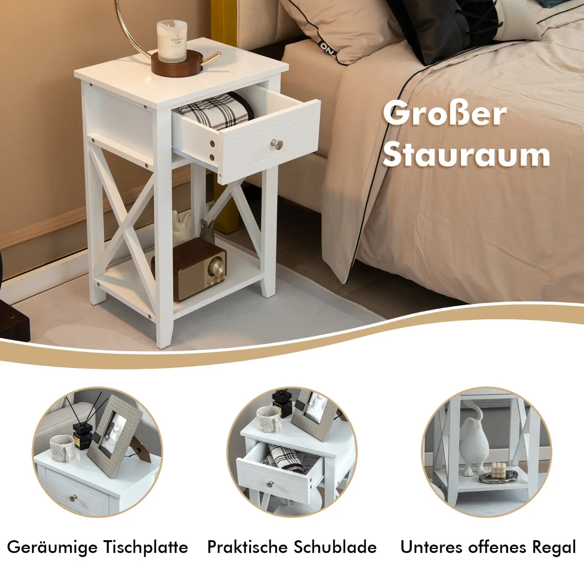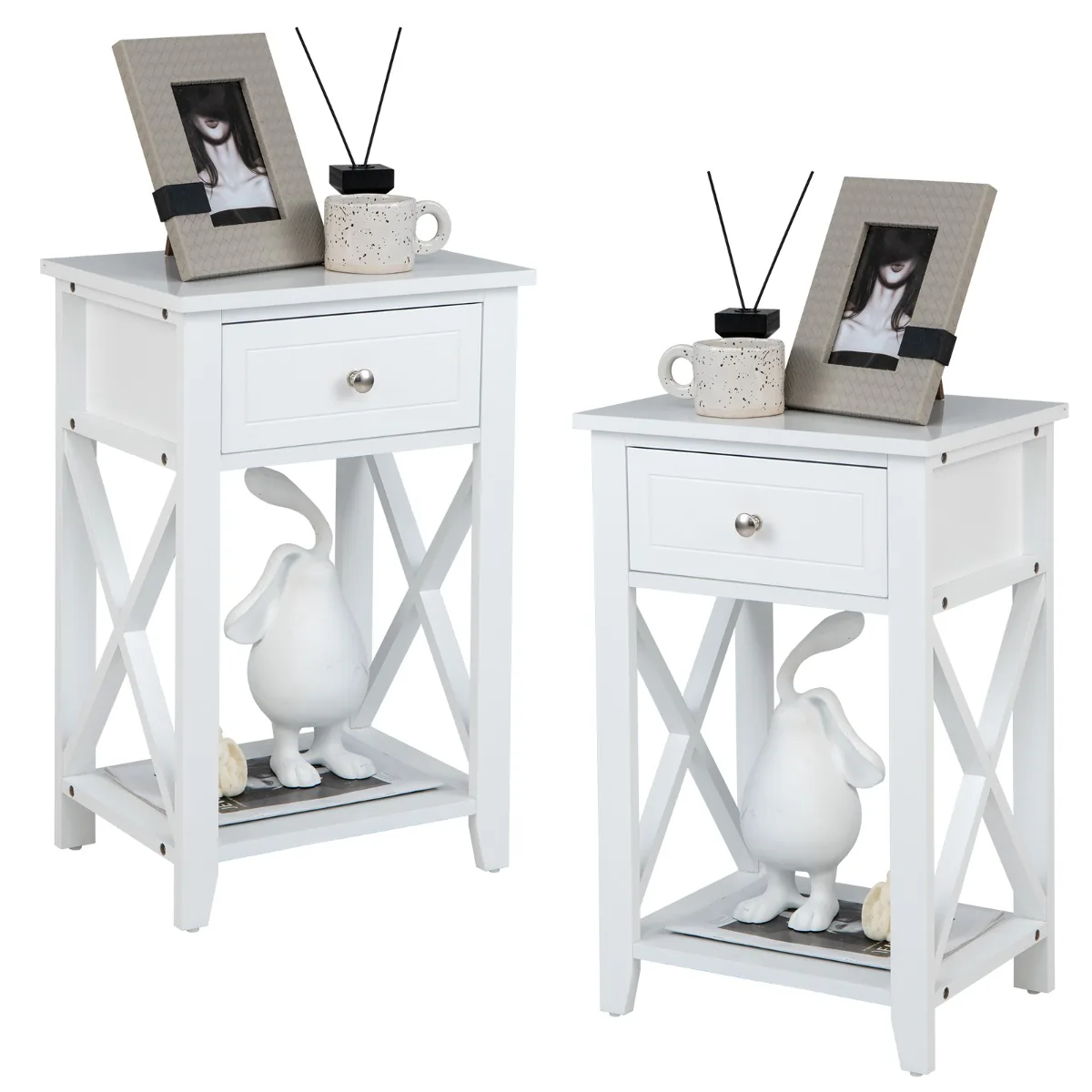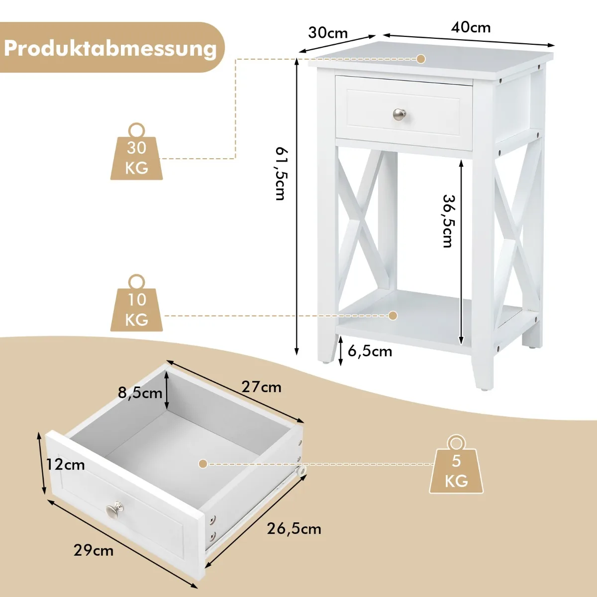 Rinkinys iš 2 naktinių staliukų baltos spalvos, matmenimis 40x30x61,5 cm, puikiai tinka vietai šalia lovos ar sofos. Kompaktiški ir funkcionalūs staliukai suteikia papildomą saugojimo vietą bei patogumą kasdieniam naudojimui. Tai praktiški baldiniai sprendimai, tinkantys įvairiems kambariams.