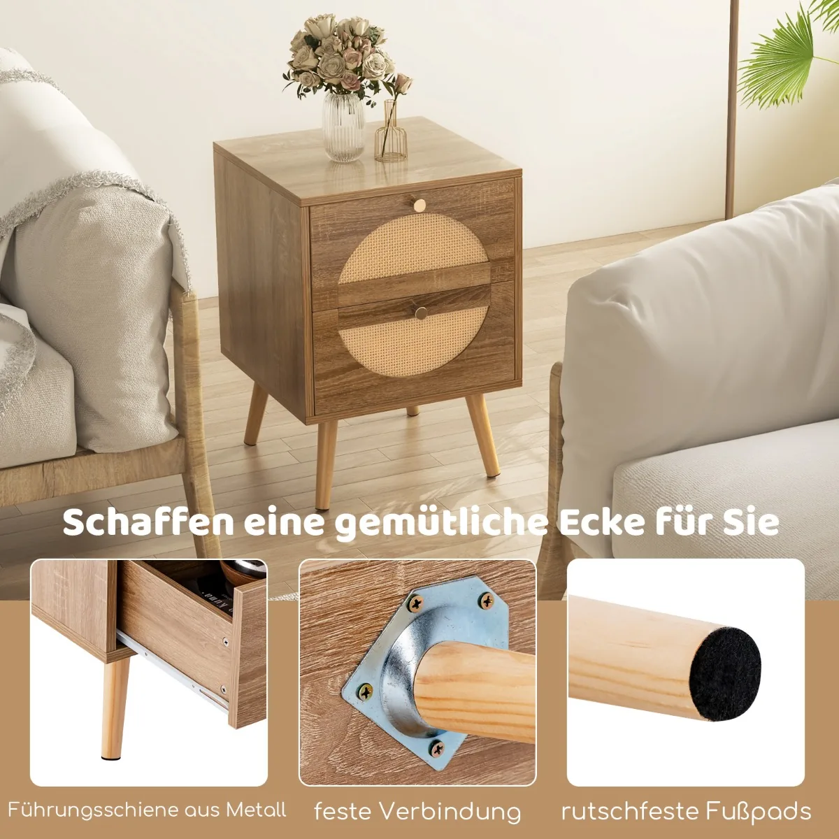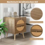 Rinkinys iš 2 naktinių staliukų rudos ir šviesiai rudos spalvų derinyje puikiai tiks miegamajam ar svetainei. Šie naktiniai staliukai pasižymi geometriniu raštu su rotango detalėmis, suteikiančiais natūralų bohemiško stiliaus akcentą. Dėl kompaktiškų matmenų ir kelių saugojimo lygių jie yra praktiškas sprendimas įvairioms erdvėms.