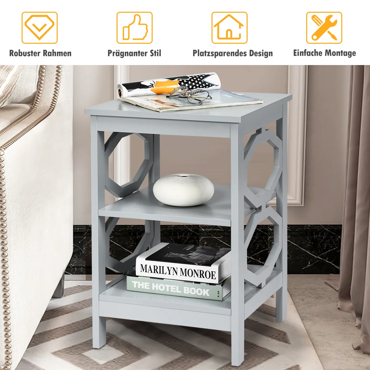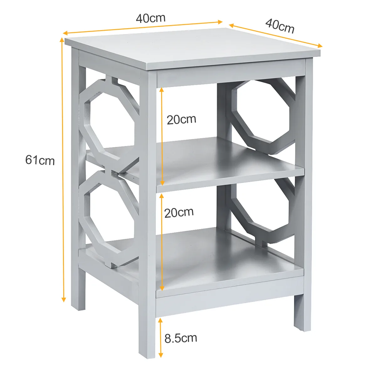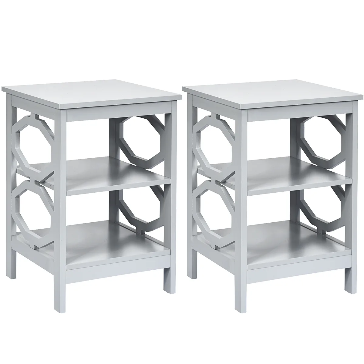 - Du pilkos spalvos naktiniai staliukai su trimis atviromis lentynomis daiktų laikymui.