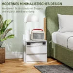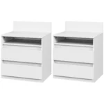 Patirkite elegantišką minimalistinio dizaino HOMCOM naktinio staliuko komplektą be rankenų. Su dviem sklandžiai stumdomais stalčiais ir atviru skyriumi, ši spintelė prie lovos jūsų daiktus sutvarkys ir lengvai pasieksi. Pagaminta iš medžio drožlių plokštės su melamino danga, suteikia modernią ir švarią išvaizdą. Dviguboje pakuotėje šie naktiniai staleliai sukuria harmoningą atmosferą skirtinguose kambariuose.