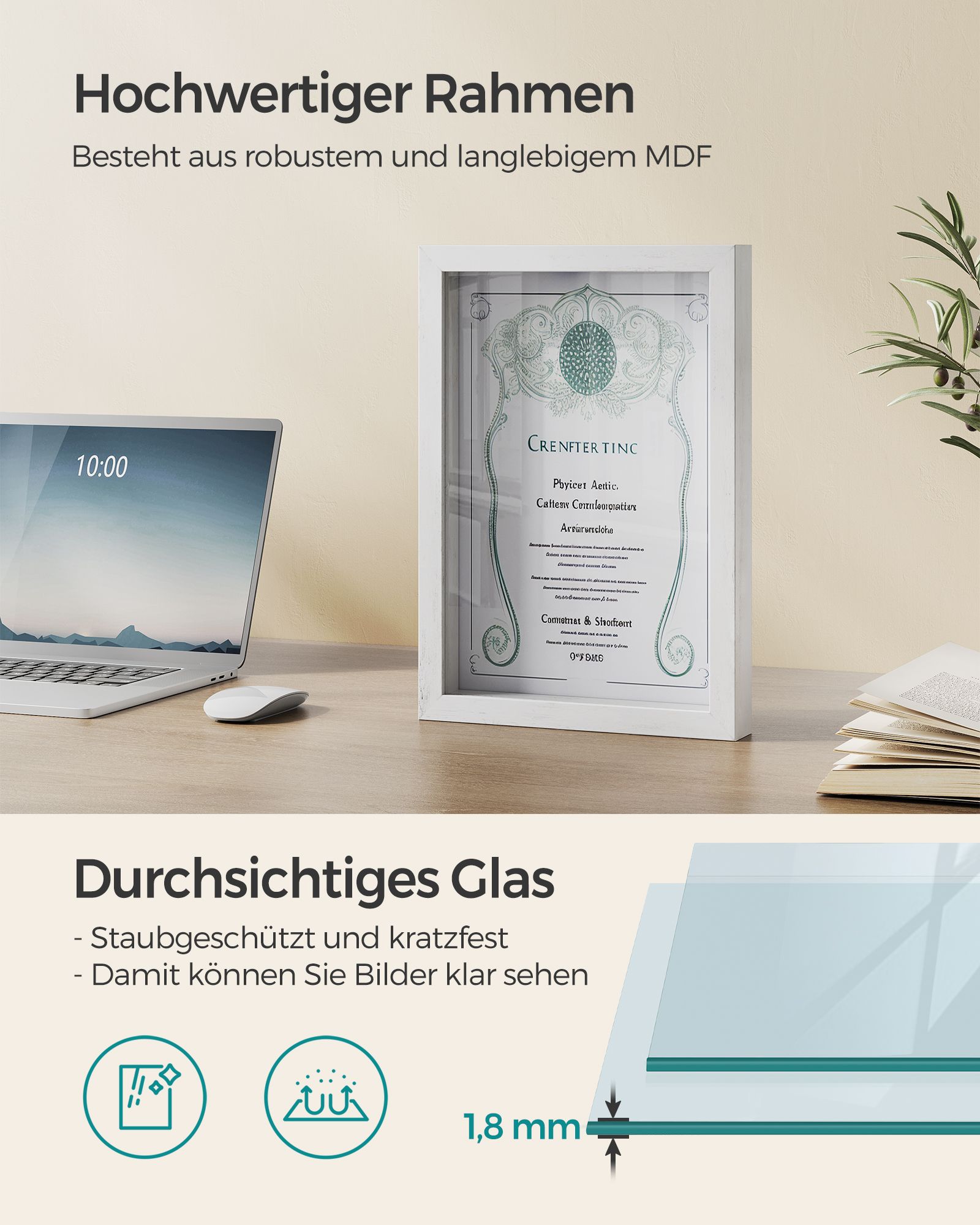 Šie rėmeliai yra pagaminti iš aukštos kokybės MDF medžiagos, kuri užtikrina ilgaamžiškumą ir patvarumą. Stiklo paviršius apsaugo jūsų nuotraukas nuo dulkių ir pažeidimų, išlaikydamas jų ryškumą ir grožį. Vintažinė balta spalva suteikia rėmeliams subtilų ir rafinuotą išvaizdą, kuri dera su įvairiais interjero stiliais.