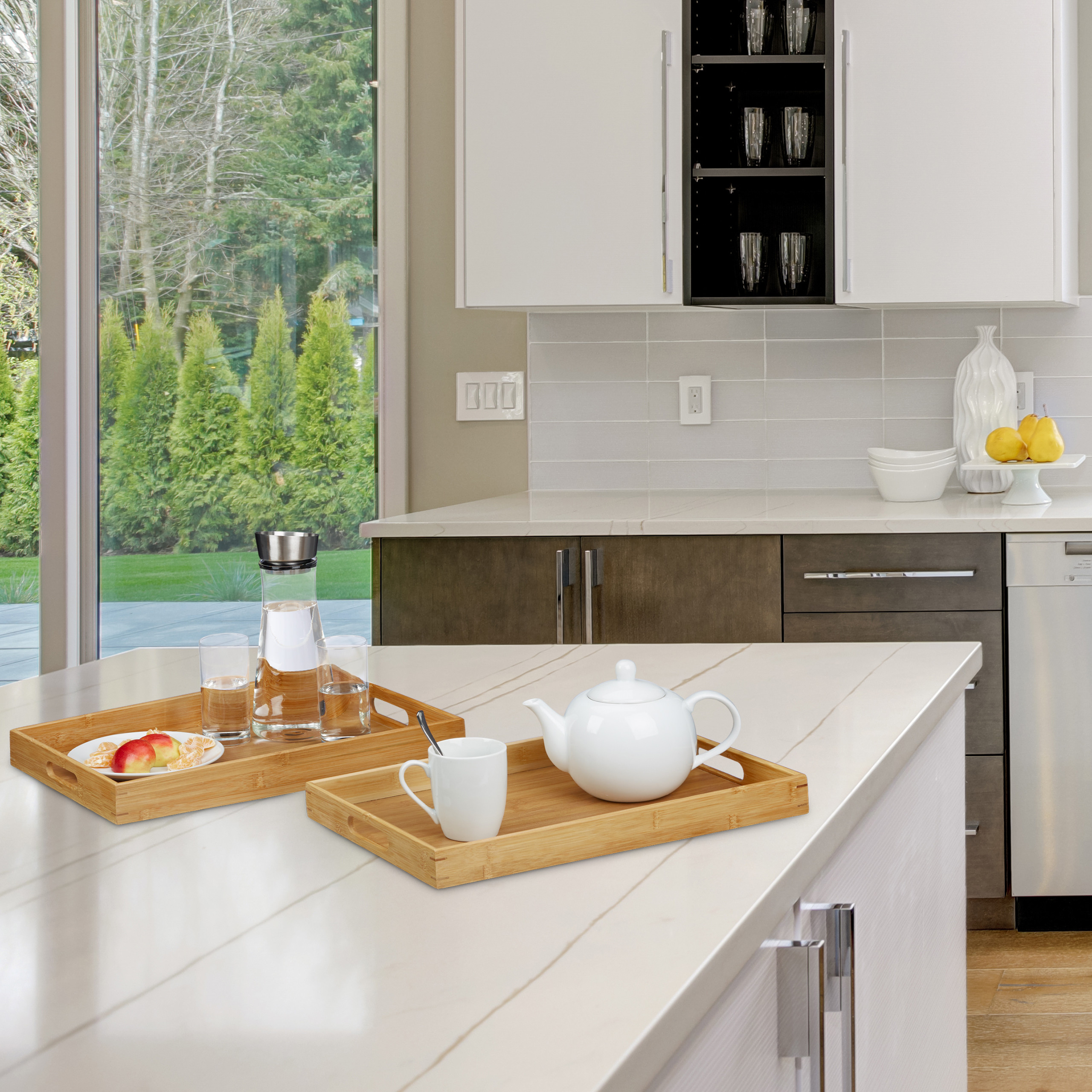 Pristatome elegantišką ir funkcionalų dviejų bambukinių serviravimo padėklų rinkinį, kuris taps nepakeičiamu pagalbininku jūsų namuose. Šie padėklai ne tik palengvins maisto, gėrimų ir kitų svarbių daiktų transportavimą, bet ir suteiks jūsų interjerui natūralios elegancijos.