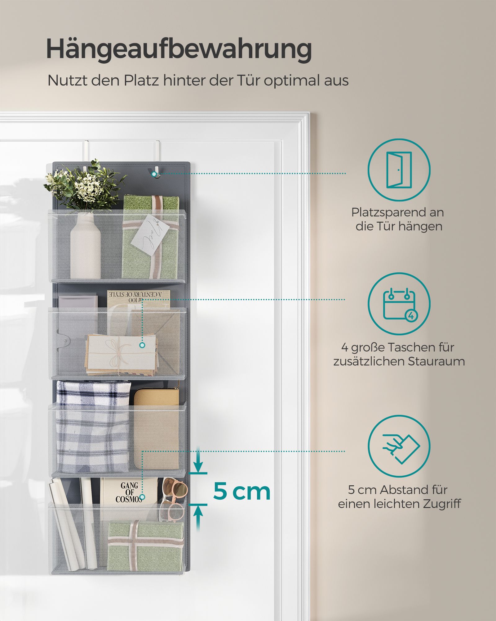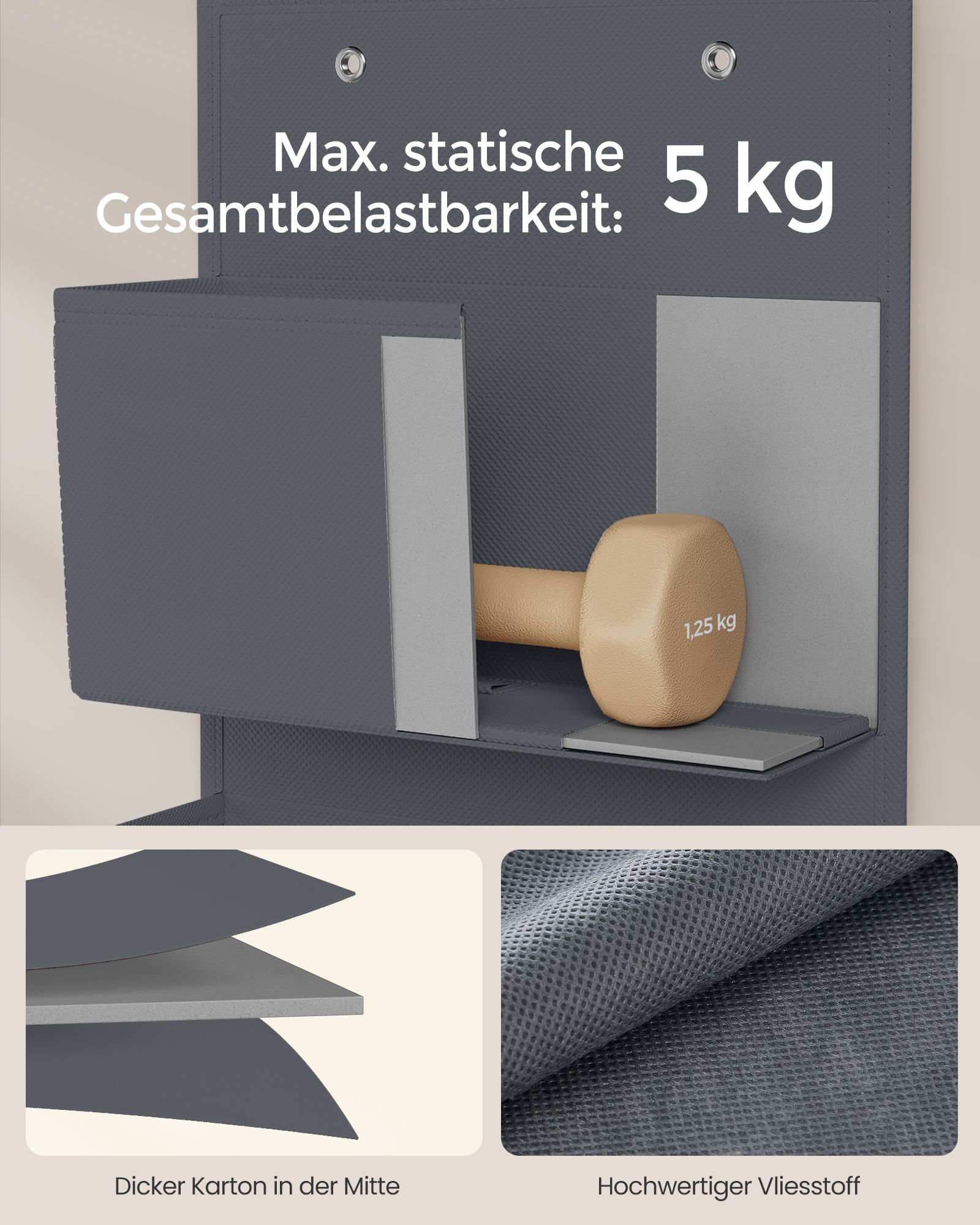 - Maksimali statinė apkrova vienam pakabinamam organizatoriui: 5 kg