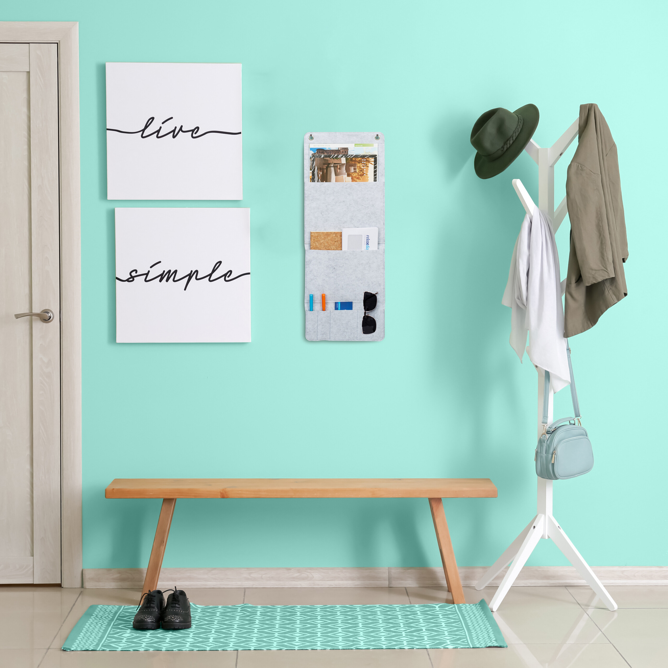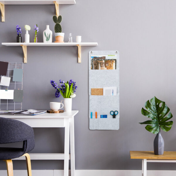 Pristatome jums praktišką ir stilingą sprendimą jūsų namų tvarkai – rinkinį iš 2 pakabinamų organizatorių. Šie organizatoriai ne tik suteiks daugiau struktūros jūsų sienoms, bet ir padės efektyviai išnaudoti erdvę. Pagaminti iš kokybiško veltinio, jie yra lengvai pakabinami ant ąselių, todėl galite greitai ir paprastai sukurti papildomą saugojimo vietą.