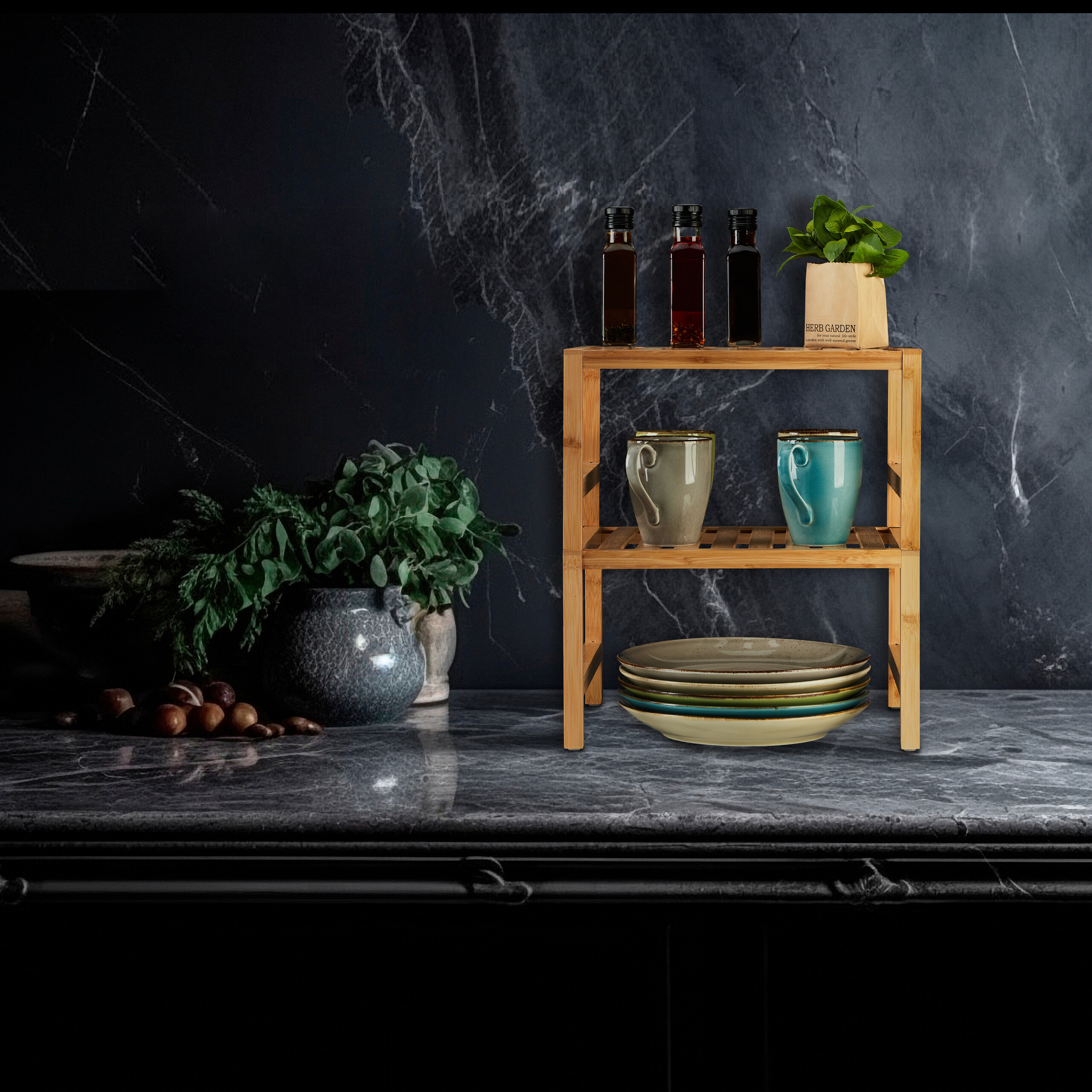 • Natūralus dizainas: Pagamintos iš aukštos kokybės bambuko, šios lentynos įneša į jūsų virtuvę šiek tiek natūralumo ir šilumos.