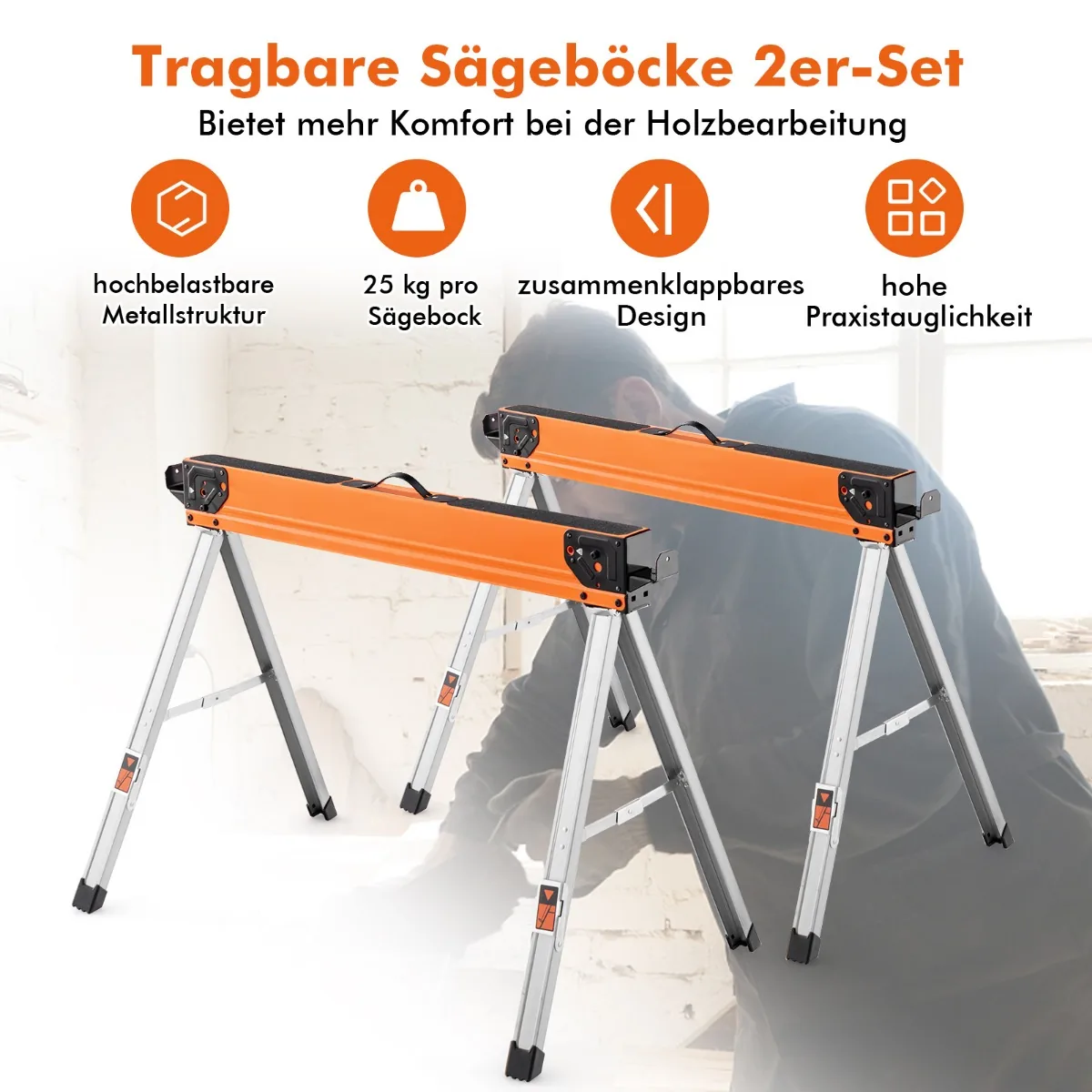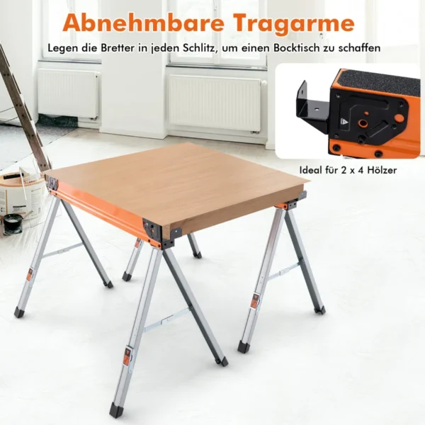 Rinkinys iš 2 pjūklos stovų (106x76x59 cm) sidabrinės ir oranžinės spalvos suteikia patogią ir patikimą darbo platformą medžio apdirbimui. Šie nešiojami, sulankstomi pjūklai pasižymi tvirta metaline konstrukcija ir universaliomis funkcijomis, kurios palengvina įvairius medienos apdirbimo darbus tiek namų, tiek profesionalioje aplinkoje.
