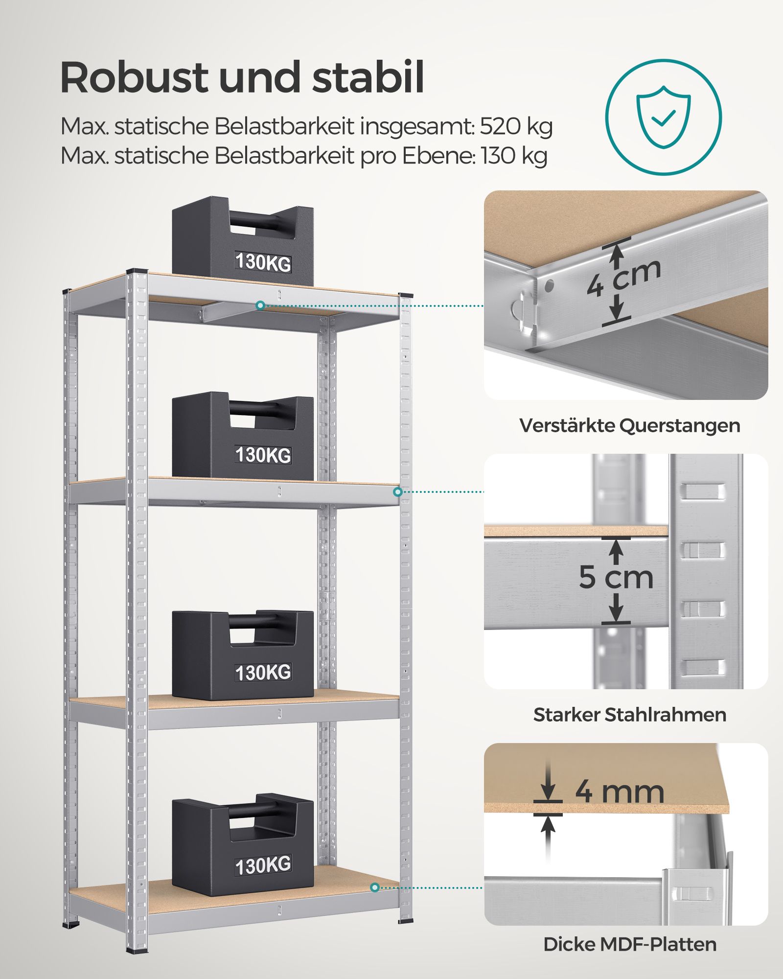 - Maksimali kiekvienos lentynos statinė apkrova: 130 kg – užtikrina, kad galėsite saugiai laikyti net ir sunkesnius daiktus.