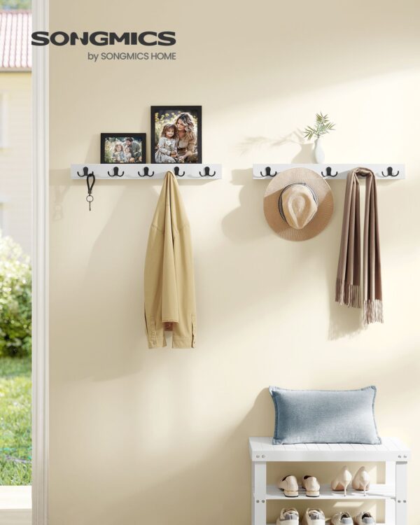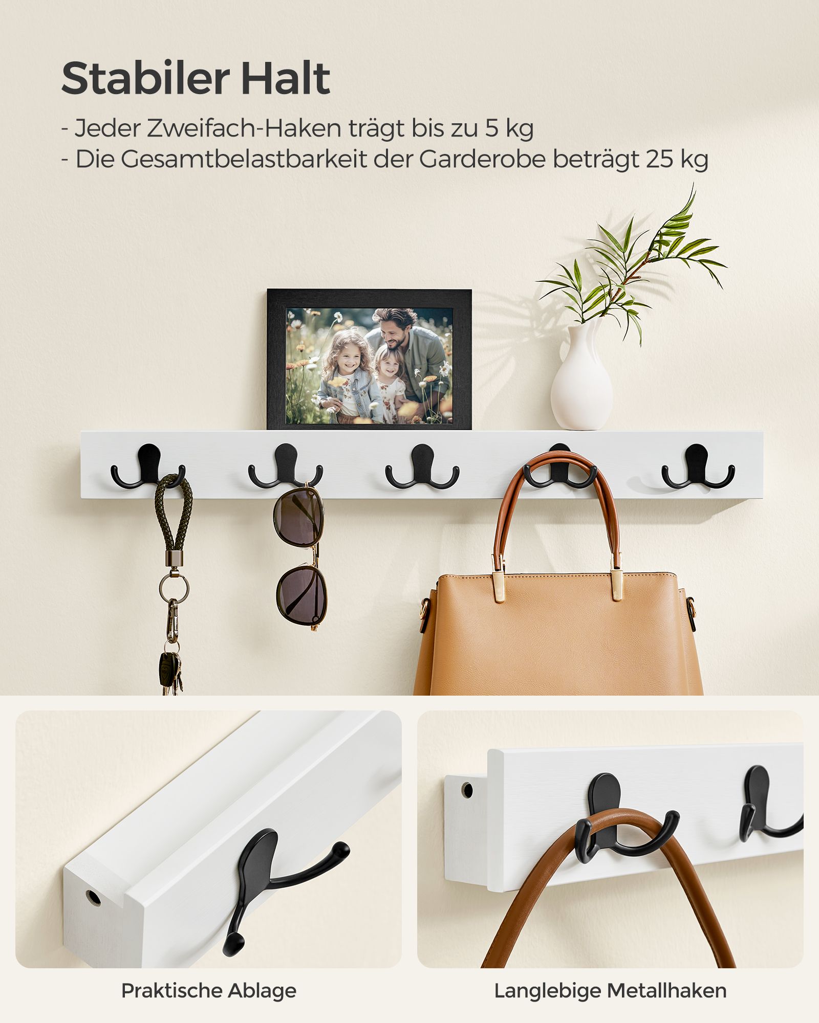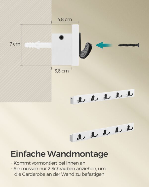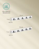 - Maksimali statinė apkrova vienam kabliui: 5 kg – pakankamai stiprios, kad laikytų jūsų paltus, rankines ar kitus daiktus.