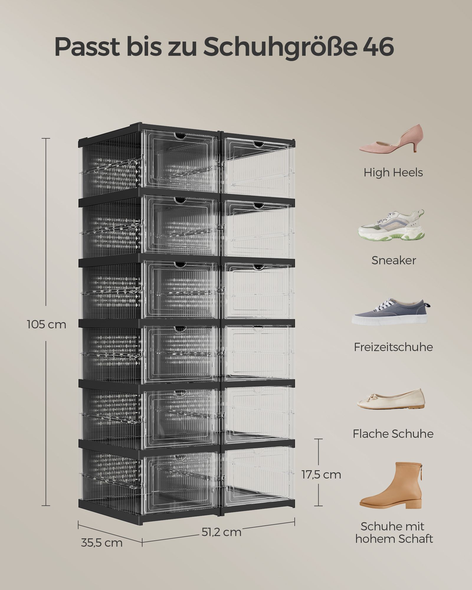 - Vienos batų spintelės dydis: 35,5 x 25,5 x 105 cm (Ilgis x Plotis x Aukštis)