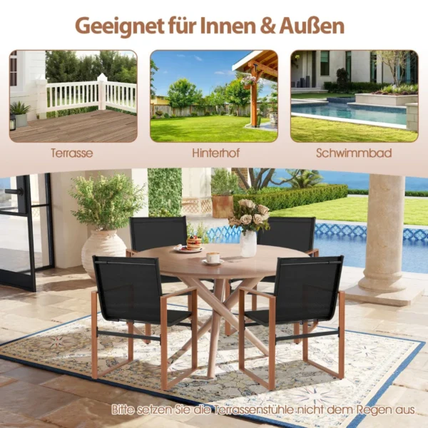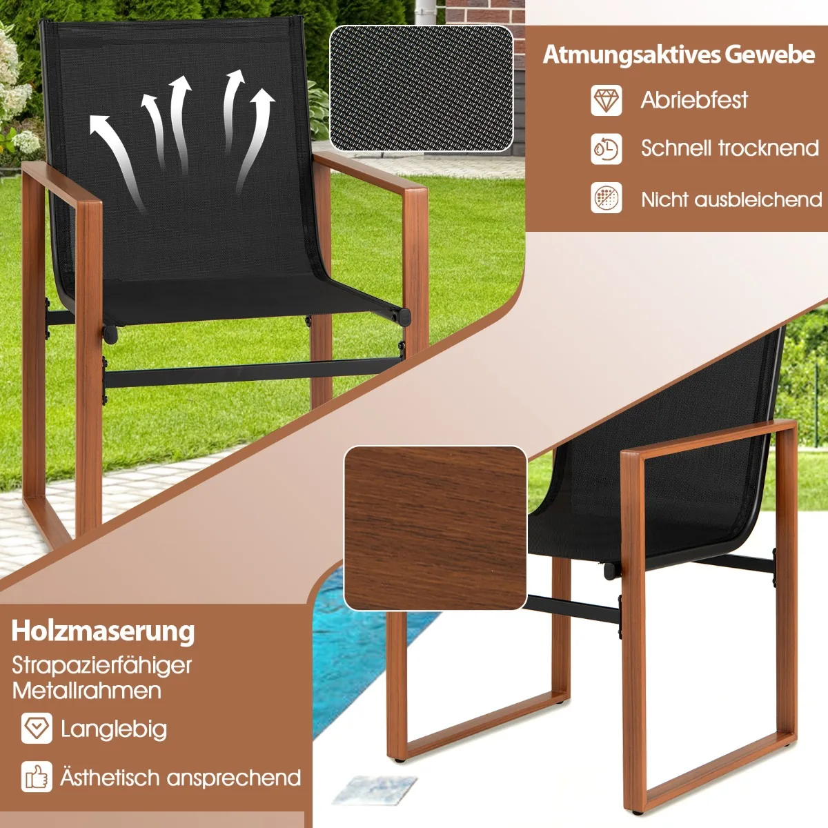 Rinkinys iš 2 sodo kėdžių puikiai tinka lauko poilsiui terasoje, kieme ar prie baseino. Kėdės pagamintos iš kvėpuojančio audinio ir tvirto metalinio rėmo, užtikrinant patogumą bei ilgaamžiškumą. Ergonomiškas dizainas bei reguliuojamos pėdų pagalvėlės leidžia prisitaikyti prie įvairaus paviršiaus ir suteikia stabilumo.