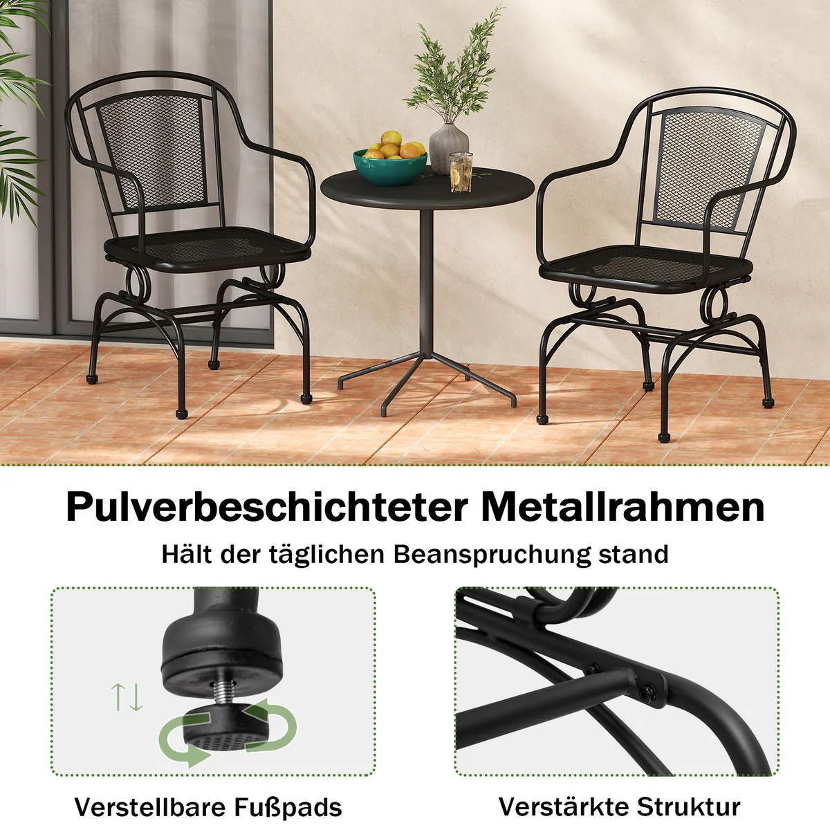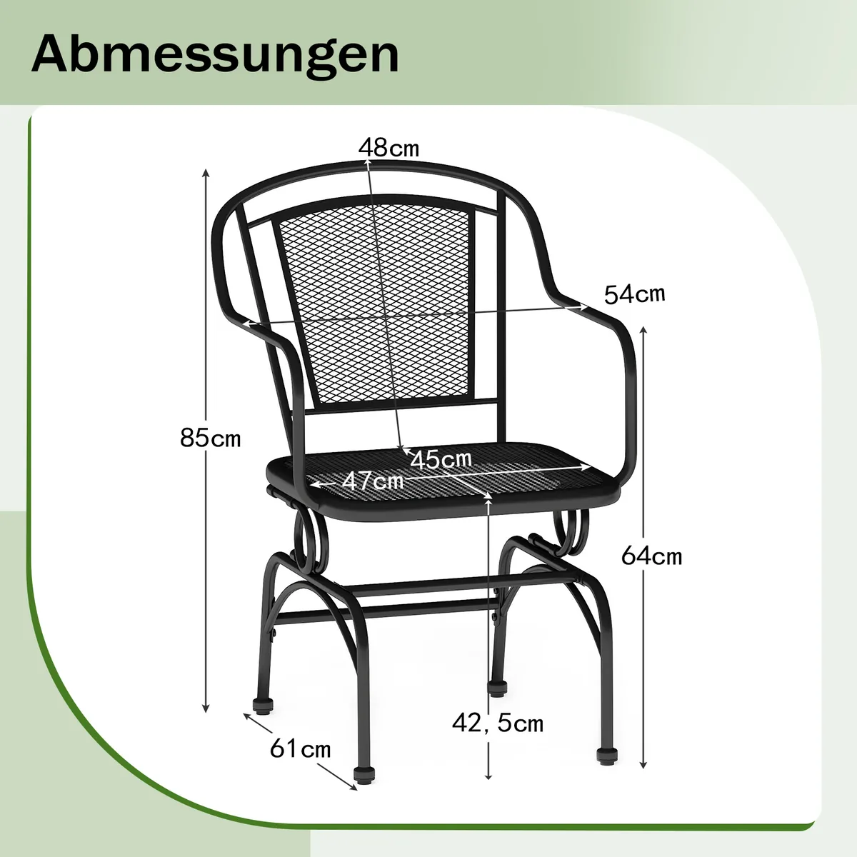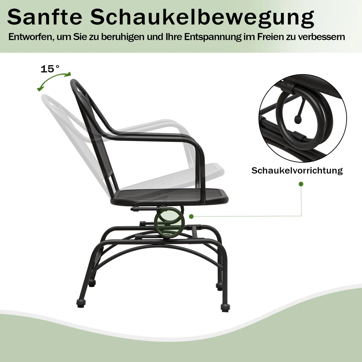 Rinkinys iš 2 sodo kėdžių 61x54x85cm, juodos spalvos, skirtas komfortiškam poilsiui lauko sąlygomis. Supamosios kėdės puikiai tinka atsipalaidavimui terasoje, balkone ar kieme, užtikrinant patogumą ir oro cirkuliaciją per metalines kvėpuojančias sėdynes. Patvari konstrukcija ir reguliuojamos pėdų pagalvėlės suteikia stabilumą įvairiuose paviršiuose.