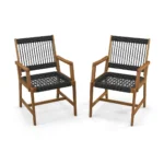 Rinkinys iš 2 sodo kėdžių 64x57x90cm, pagamintų iš akacijos medienos ir rankomis austų plastikinių virvių, puikiai tinka lauko ir vidaus erdvėms. Kėdės derina natūralią medieną su juodos spalvos virvėmis, užtikrinančiomis oro pralaidumą ir atsparumą oro sąlygoms. Šis lauko baldų rinkinys yra funkcionalus pasirinkimas terasoms, sodams ar verandoms.