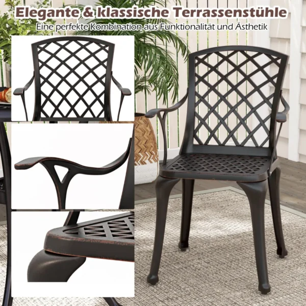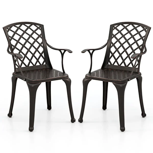 Rinkinys iš 2 sodo kėdžių 66x57x94cm, tamsiai raudonos spalvos, puikiai tiks jūsų lauko erdvei. Kėdės pagamintos iš lieto aliuminio, atsparios rūdijimui ir skirtos naudoti įvairiomis oro sąlygomis. Ergonomiškas dizainas ir kvėpuojantis tinklelio raštas užtikrina komfortą sėdint tiek sode, tiek balkone.