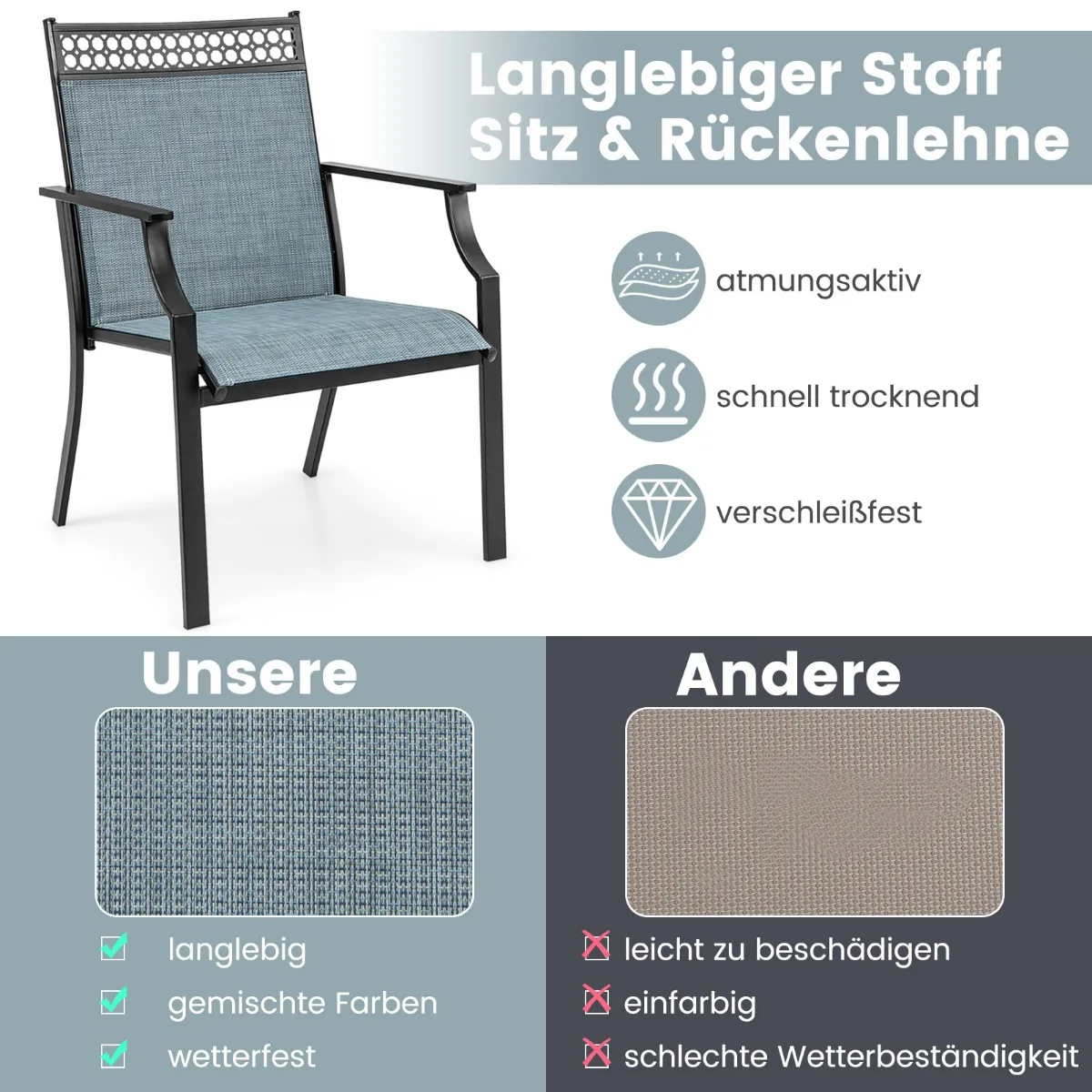 Rinkinys iš 2 sodo kėdžių 66x61x90cm, juodos ir mėlynos spalvos puikiai tinka lauko erdvėms, tokioms kaip sodas, terasa ar baseino zona. Šios kėdės yra pagamintos iš patvaraus audinio ir tvirto metalinio rėmo, užtikrinančio ilgaamžiškumą bei komfortą. Lengvas surinkimas leidžia greitai ir paprastai įrengti kiemo baldus.