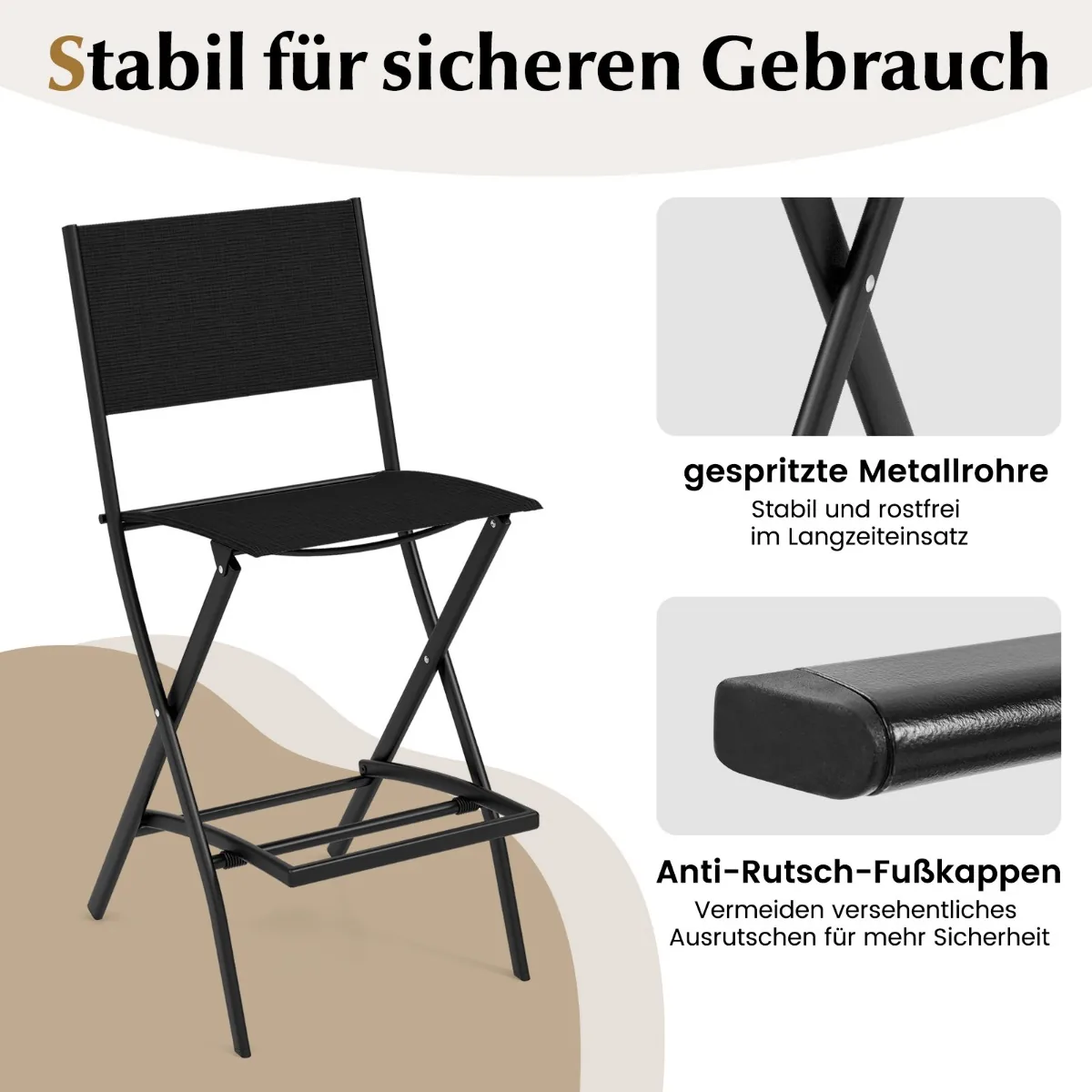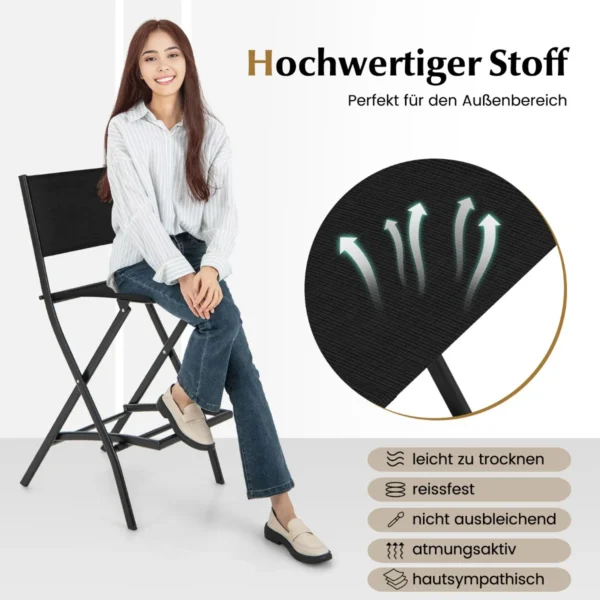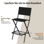 Rinkinys iš 2 sodo sulankstomų kėdžių juodos spalvos idealiai tinka įvairioms lauko erdvėms. Šios baro kėdės pagamintos iš patvaraus audinio ir metalinio rėmo, suteikia patogią sėdėjimo patirtį bei praktišką sulankstymo galimybę. Dėl atsparumo aplinkos veiksniams ir neslystančių pėdų pagalvėlių šios kėdės tinka naudoti sode, terasoje ar balkone.