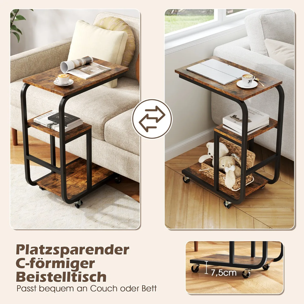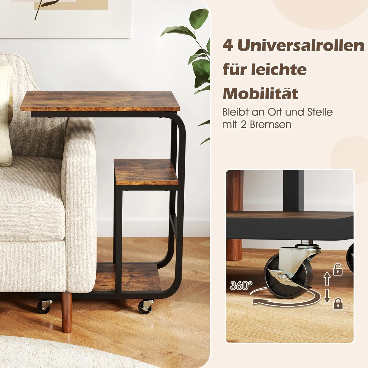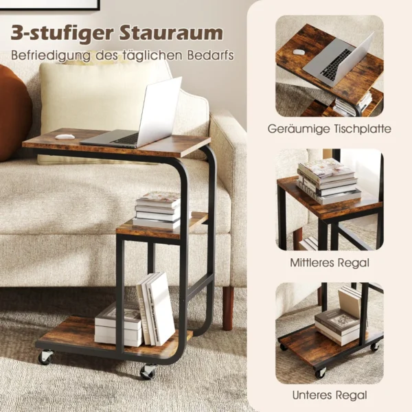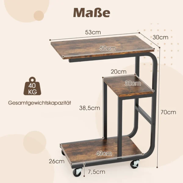 Rinkinys iš 2 šoninių staliukų 53x30x70 cm, rudos ir juodos spalvų, puikiai tinka naudojimui šalia sofos ar lovos. C formos dizainas leidžia taupyti vietą ir suteikia patogią prieigą prie daiktų. Šie metaliniai staliukai turi 3 pakopų saugyklą ir universalius ratukus, todėl juos lengva judinti ir pritaikyti pagal poreikį.