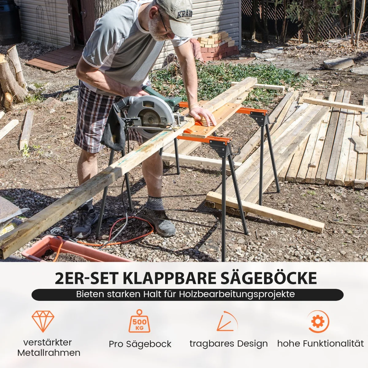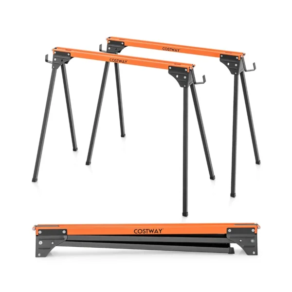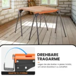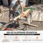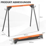 Rinkinys iš 2 statybinių estakadų (pjūklų arkliukų) juodos ir oranžinės spalvos, skirtas medienos apdirbimo darbams. Šie nešiojami, greitai sulankstomi pjūklai puikiai tinka tiek namų, tiek profesionaliems projektams, užtikrinant patogų darbą ir didelį stabilumą.