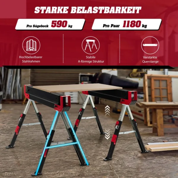 - Dviejų sulankstomų pjovimo arkliukų rinkinys, skirtas statybinėms ir medienos apdirbimo darbams.